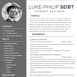 Leadership and Initiative Design Thinking Problem-Solving Computer Literacy Project Management Bilingual (English, French, German) Residential Landscape Design AutoCAD Adobe Photoshop Sketchup Rhino Camera operation (Production level) Traditional arts