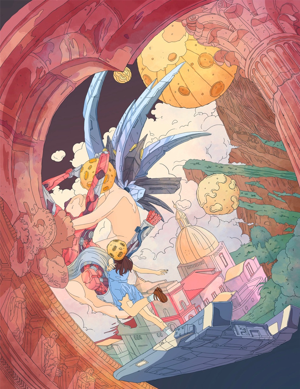 Themed around "Love," the illustrations showcase Italy's breathtaking natural landscapes and exquisite historical architecture. The sculpture "Love Kisses Psyche" is reimagined with a contemporary high-tech design.