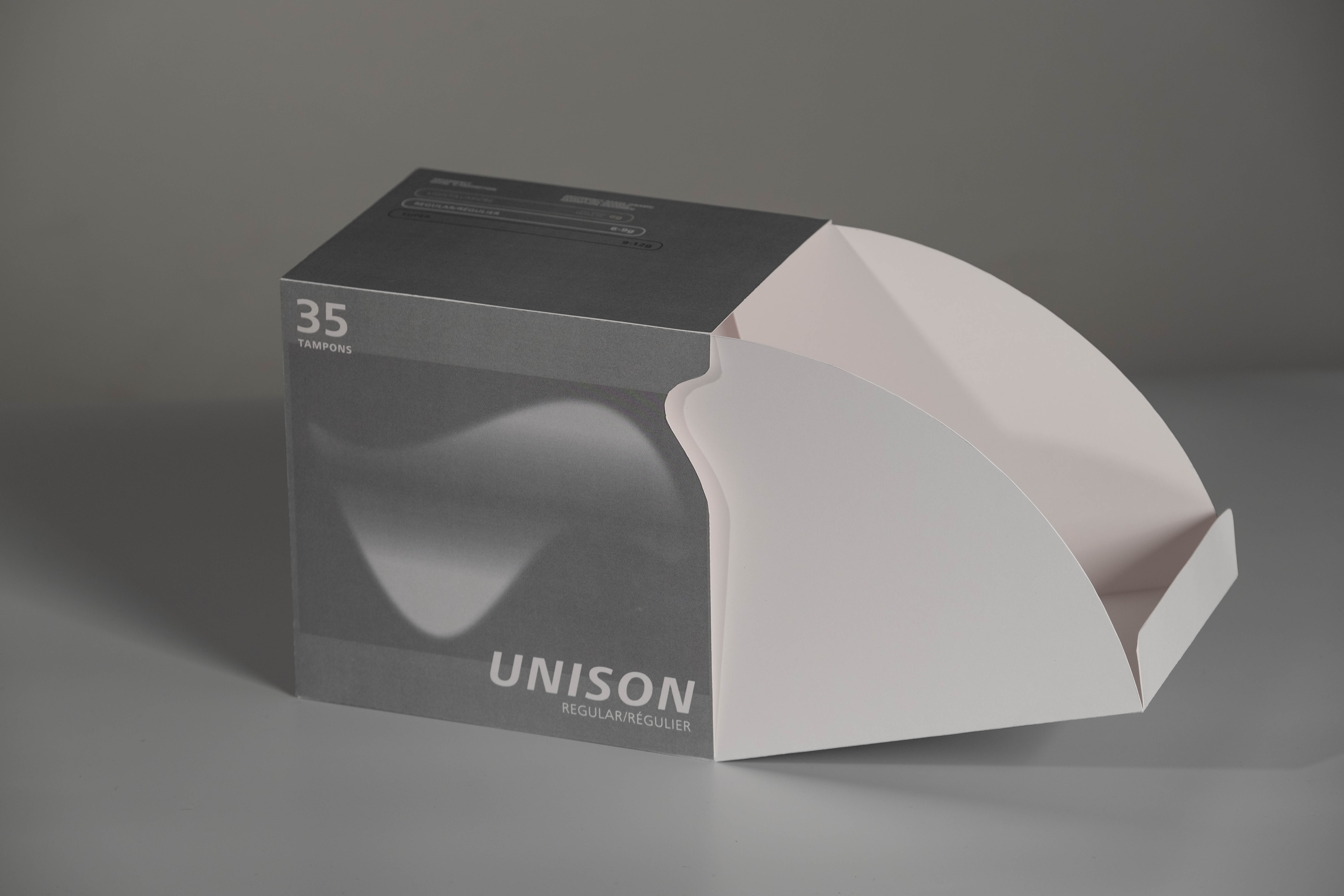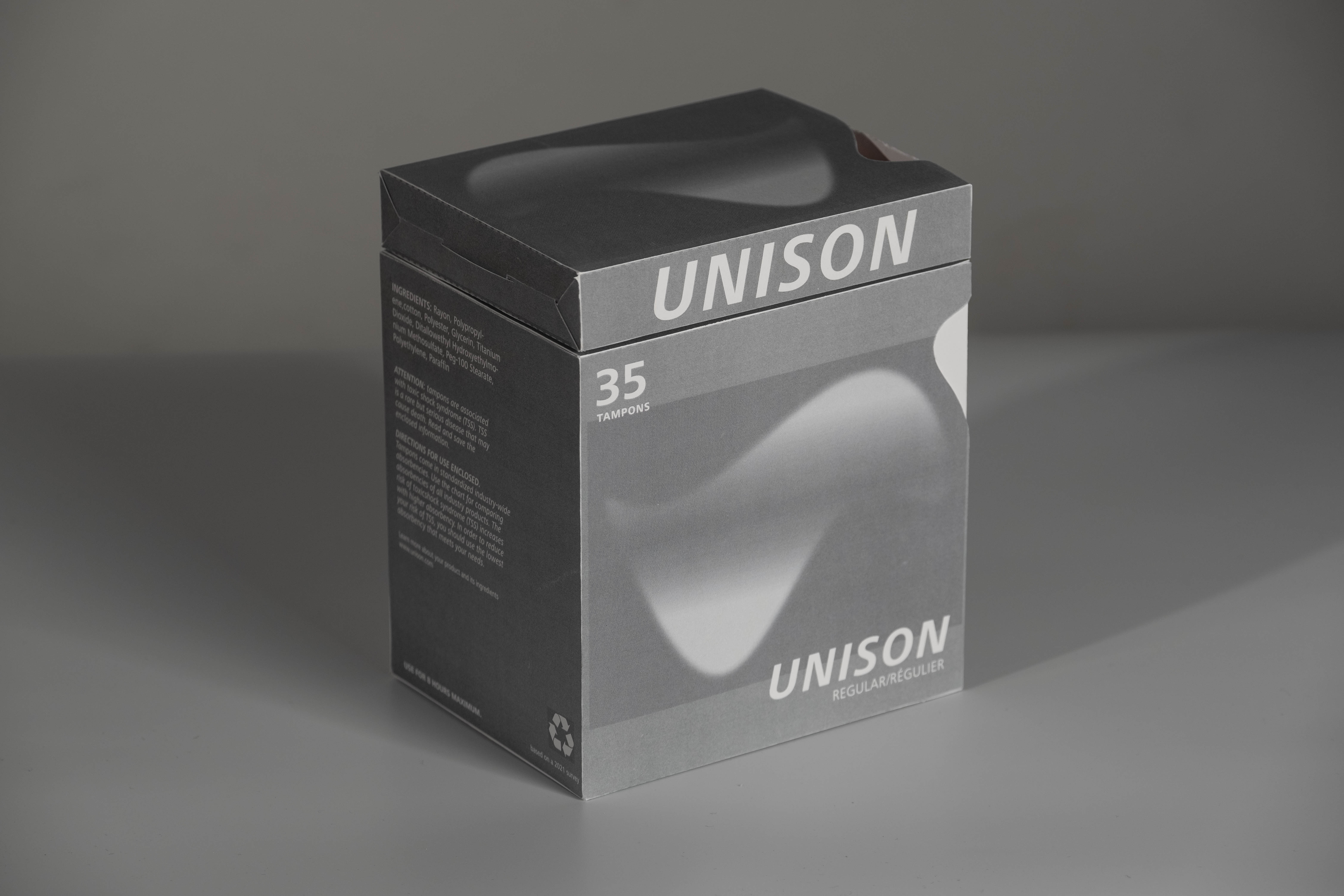 “Vincent Zhou and Yingran Xu collaborated on packaging design as a group project. We developed a packaging design for menstrual products that caters to a gender-inclusive customer base, providing a more convenient and neutral experience. The brand name UNISON embodies our commitment to gender equality and social harmony, and we aspire to promote inner harmony for all genders. Our approach was comprehensive, considering the unique needs of this customer group and incorporating eco-friendliness, portability, and minimalist design into the packaging. We used a timeless grey color as the main theme to differentiate from high-contrast and highly saturated packaging designs, offering a distinct solution for all customers.”