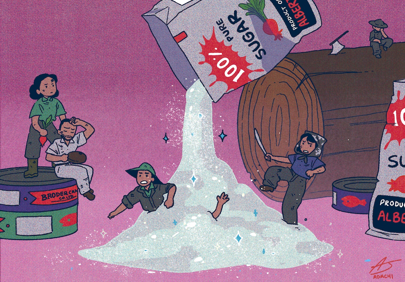 Japanese Canadians who were not sent to internment camps were otherwise sent to work on sugar beet farms, canneries, or logging camps. This illustration reimagines this point in the Japanese Canadian uprooting.