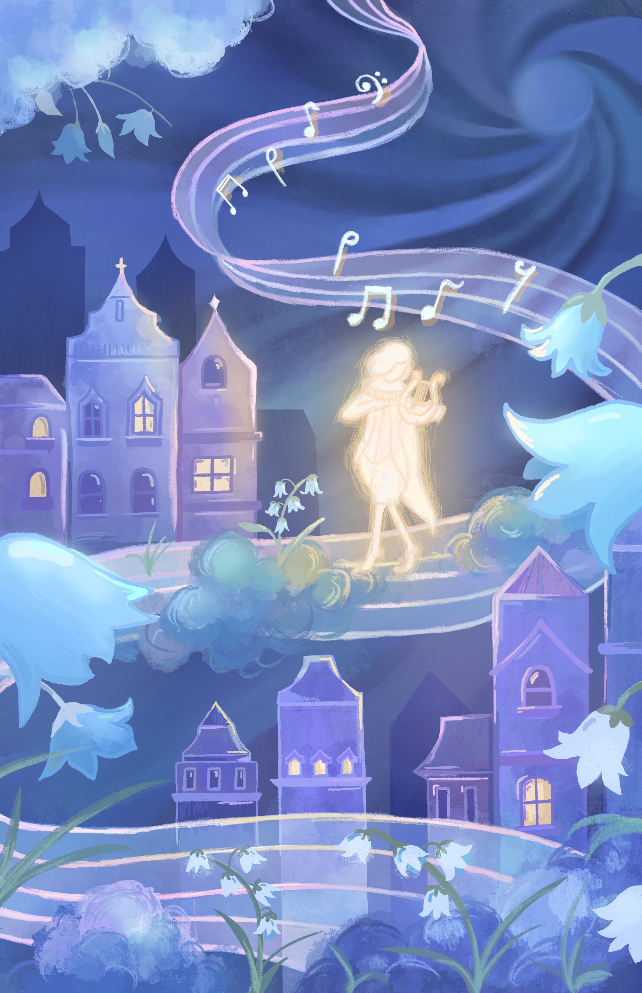 In the Middle Ages, a troubadour with a Wye harp filled the town with harmony, drawing people to peace as bluebells swayed to his melodies, merging flora with music.