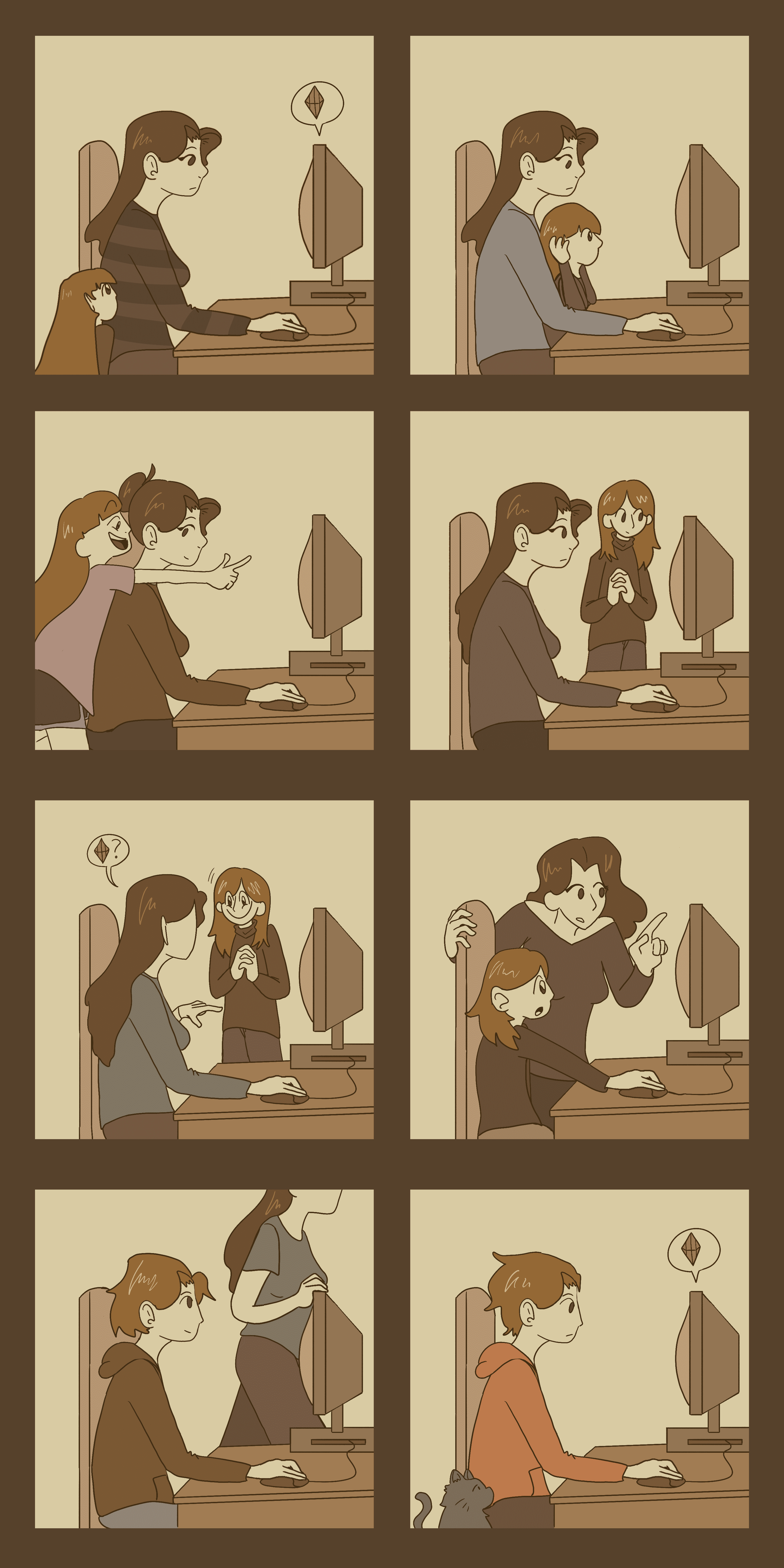 Sims 2:When I was young, I used to watch my older sister play the game "Sims 2" on her old chunky computer. Though she wasn't very interested in teaching me how to play at first, she slowly warmed up to the idea and sat me down in her chair to teach me how to play. Years went by, and slowly I started to play on my own. Now to this day, we will walk in on each other playing a new save file on the sims to relieve our stress. When I play this game I imagine that I am still seven years old and my sister is fourteen.