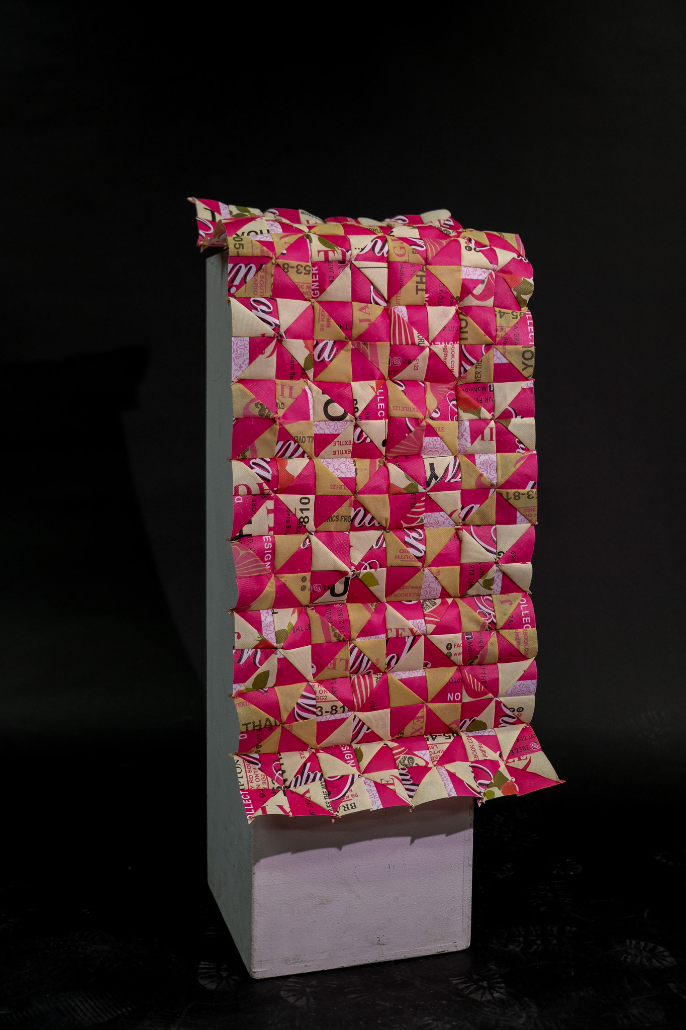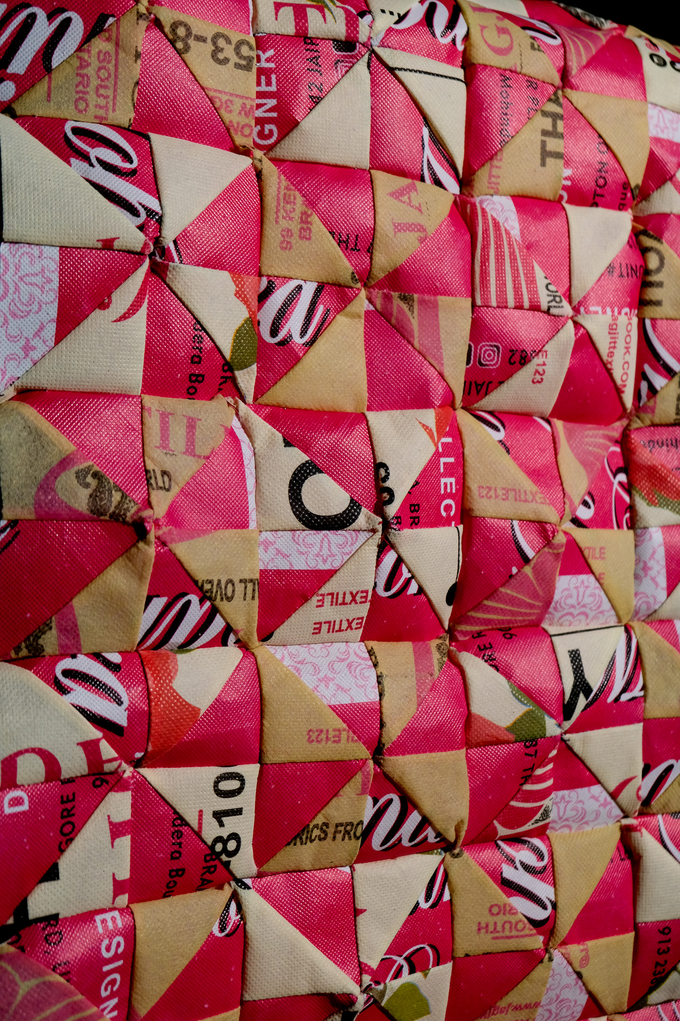 Jugaad Principle 2: giving an item a new value/form after its expected lifespan.The idea for this sewed piece of fabric was to use shopping bags that had no use and turn them into a designed artifact that encompassed not one, but many ideas I’m passionate about. The art of phulkari is slowly dying as the fashion industry and mass production have taken over the creative process of this once-beloved craftsmanship. Phulkari in Punjabi translates to “flower work”, a type of geometric embroidery technique made up of flower motifs. Originally done on khaddar (cotton) with embroidery floss, I decided to create my own phulkari-designed fabric using typography found on shopping bags. I found it appropriate to use the shopping bags one would find from South Asian fabric stores, ones that sell mass-produced phulkari, creating a dialogue between the shopping bags and the hand-made artifact. Not only does this work of phulkari encompass the idea of bringing back a tradition that is seemingly lost, but the narrative is tied together with the concept of jugaad. This piece of phulkari is created by shopping bags, where the shopping bags have been given a new value/form after their expected lifespan. When looking at the phulkari with the broken text, your eye forces you to look for a pattern or meaning behind the words that are printed. But instead, for the most part, you find yourself looking at the forms of the type, and that’s when you pay close attention to the design created by non-designers.