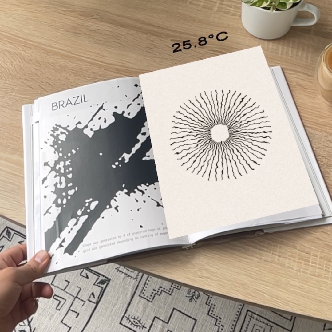 “About the project:Coffee & Climate, published in the Art & Science Review by OCAD University, is an innovative project that merges art, design, and technology to address the pressing issue of climate change impacts on coffee production. By visualizing real-time weather data from major coffee-producing countries, the project aims to enhance awareness and understanding of climate change's effects on the coffee industry. Employing Augmented Reality (AR), Coffee & Climate transforms complex weather data into engaging, intuitive visualizations, allowing users to experience the data in a dynamic, immersive format.Project results:The project involved conceptualizing and implementing the AR visualizations, utilizing generative art to represent each country’s coffee production capacity, and integrating real-time environmental data to create a compelling, informative experience.The Coffee & Climate project successfully delivered a unique experience that blends educational content with interactive design. The use of AR technology not only made the data more accessible but also helped users connect with the information on a deeper level, fostering a greater understanding of the environmental challenges faced by coffee producers.”