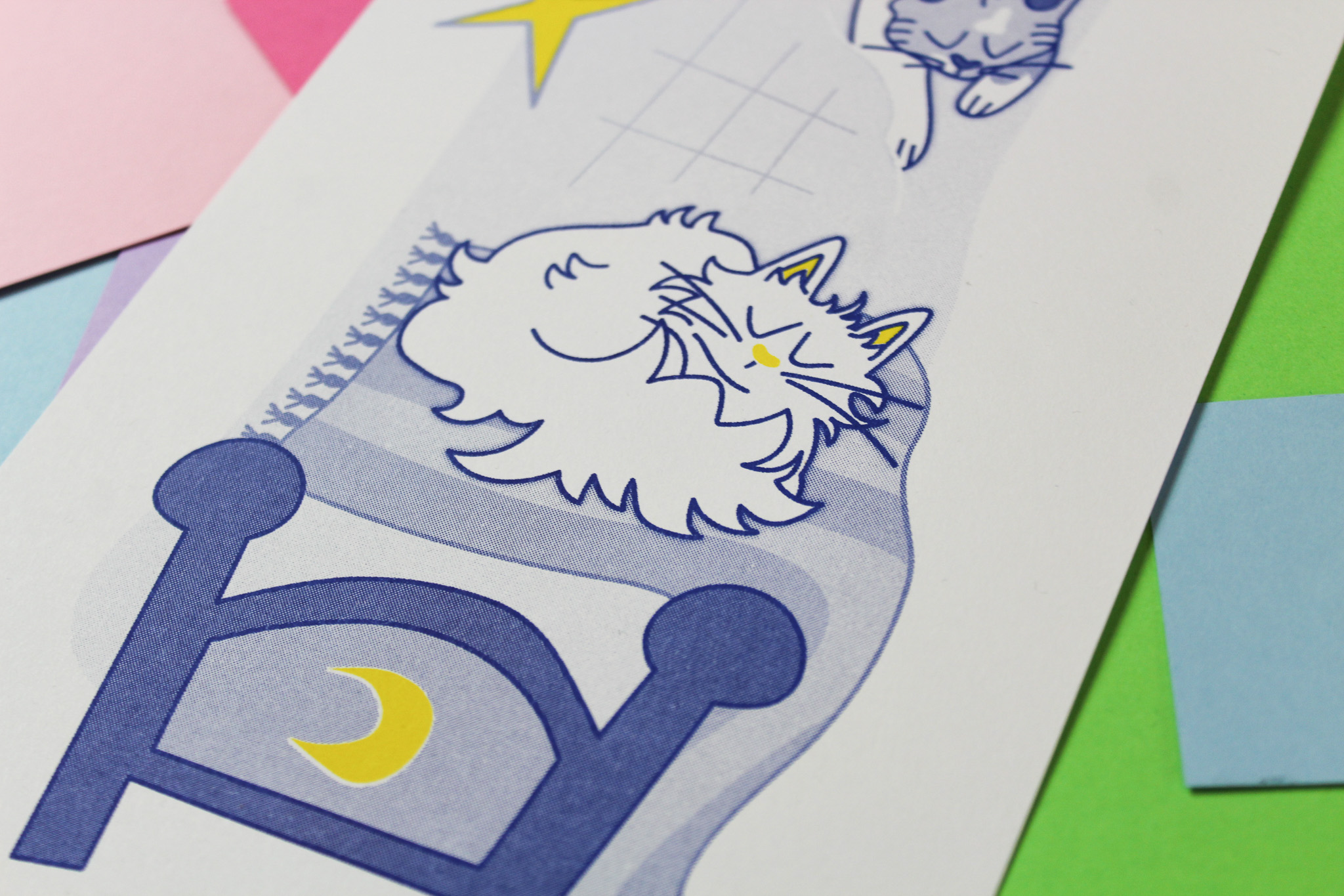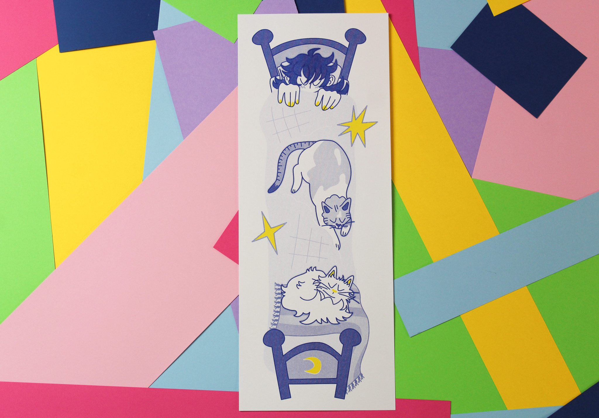 Blue and yellow risograph print of an illustration made for WHIMPER (part IV of the BLOODHOUND collection) that features myself and my cats in a skinny bed as a bittersweet ode to sleep, something I desperately need and constantly crave under the weight of chronic fatigue, but that also consumes me, limits me, confines me to certain spaces, slim boxes.Being sold in person at GradEx.