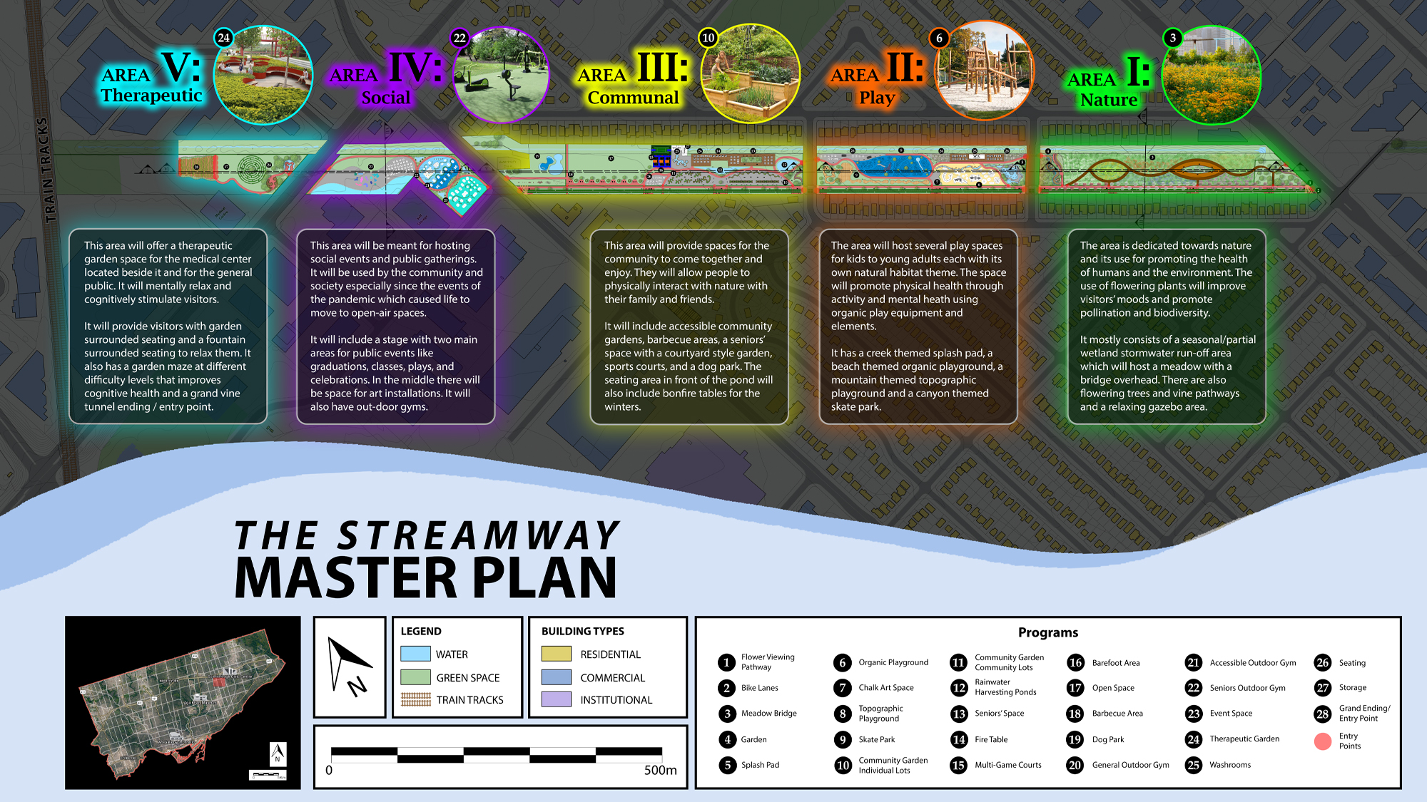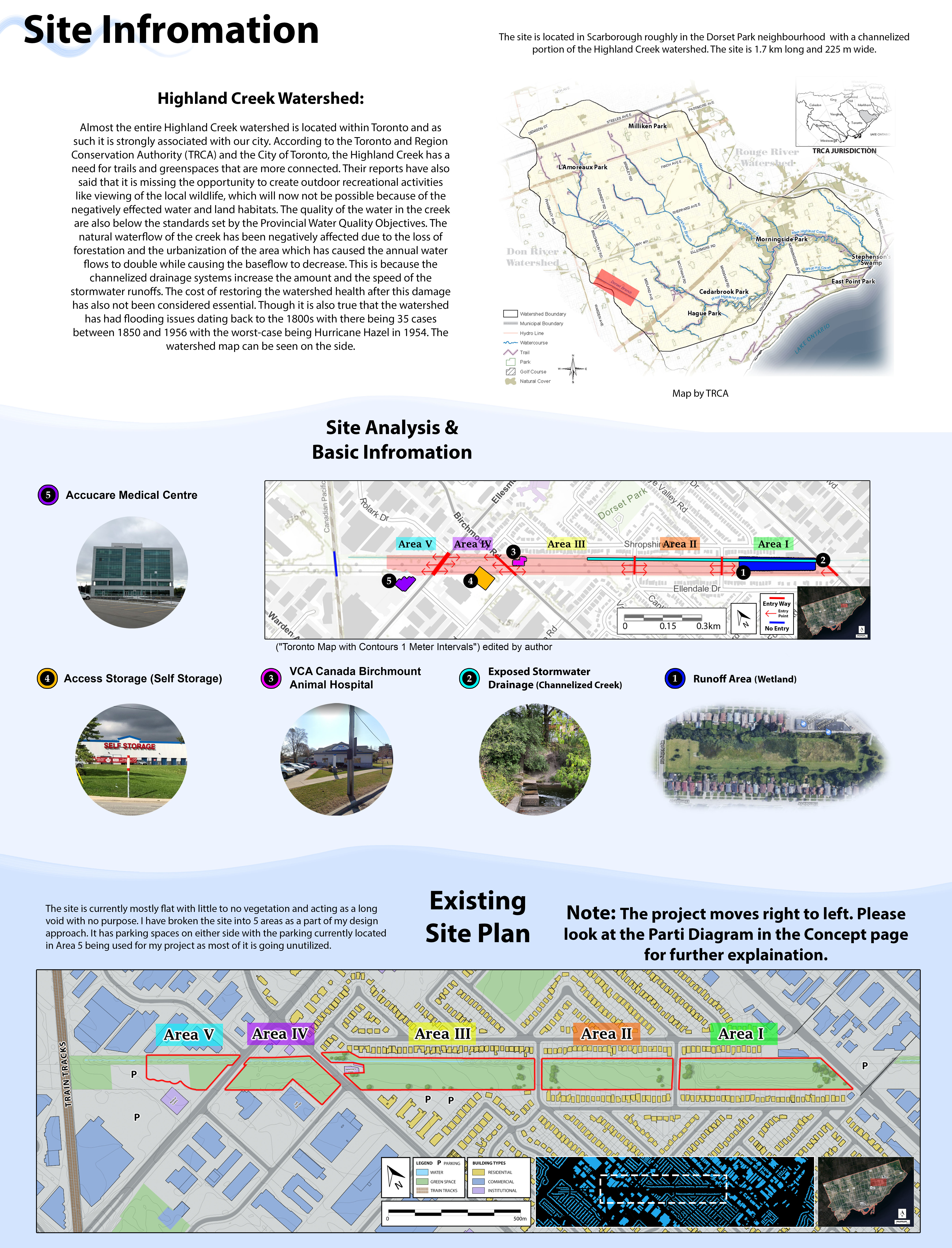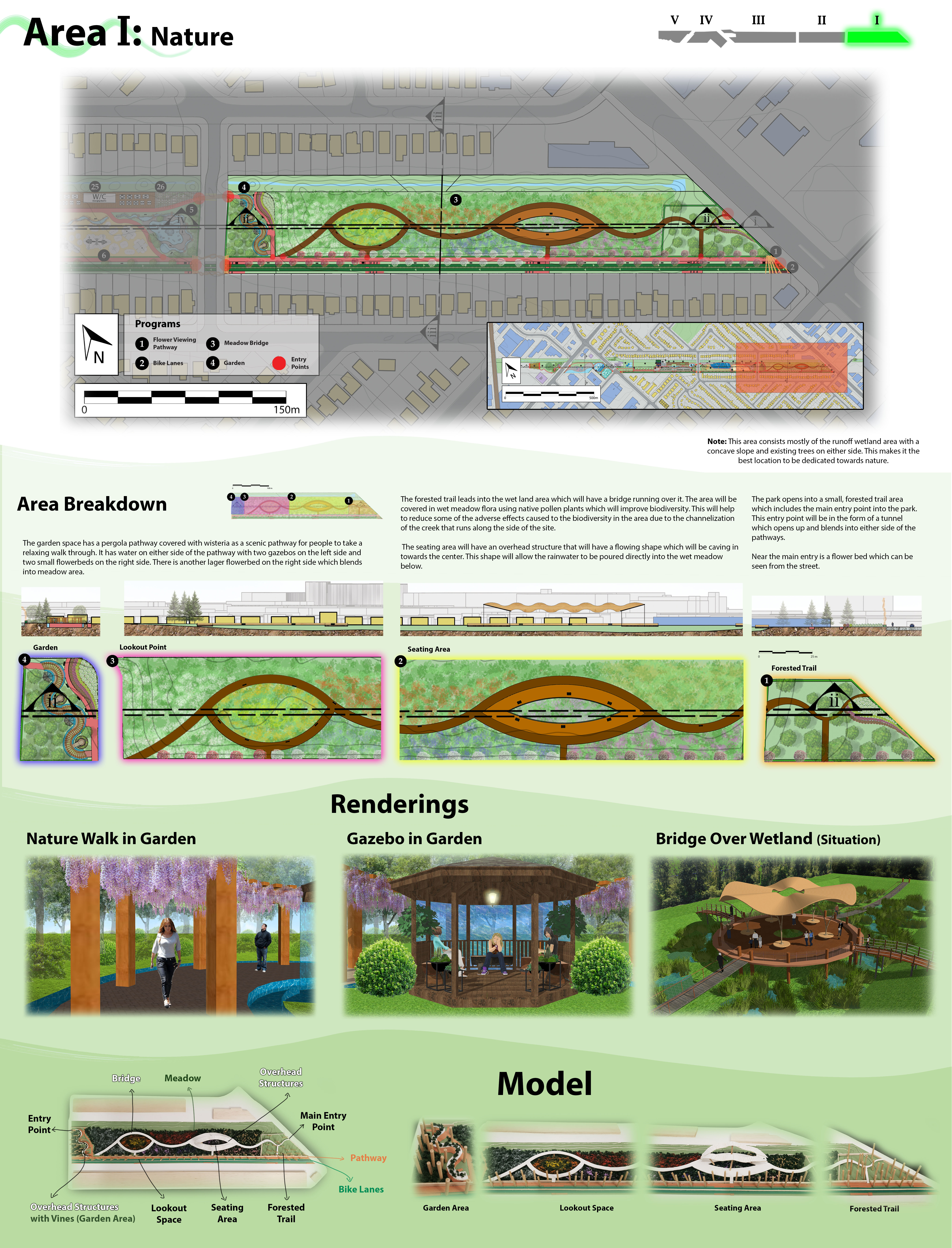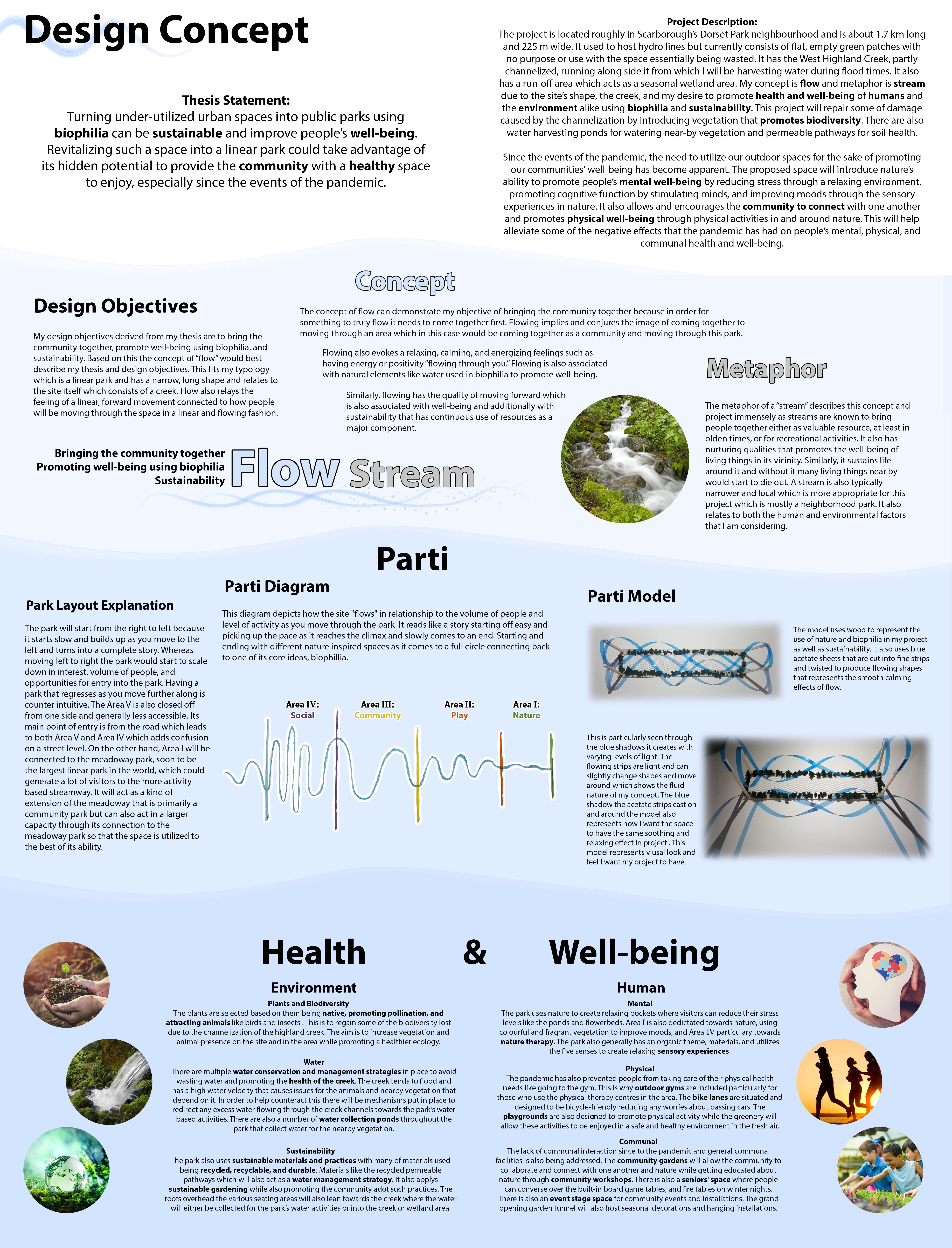 “Thesis Statement: Turning an under-utilized urban space into public parks using biophilia can be sustainable and improve people’s well-being. Revitalizing an under-utilized urban space into a linear park could take advantage of the space’s hidden potential to provide the community with a healthy space to enjoy especially since the events of the pandemic.Project Description:The project is located roughly in Scarborough’s Dorset Park neighbourhood and is about 1.7 km long and 225 m wide. It used to host hydro lines but currently consists of flat, empty green patches with no purpose or use with the space essentially being wasted. It has the West Highland Creek, partly channelized, running along side it from which I will be harvesting water during flood times. It also has a run-off area which acts as a seasonal wetland area. My concept is flow and metaphor is stream due to the site’s shape, the creek, and my desire to promote health and well-being of humans and the environment alike using biophilia and sustainability. This project will repair some of damage caused by the channelization by introducing vegetation that promotes biodiversity. There are also water harvesting ponds for watering near-by vegetation and permeable pathways for soil health.Since the events of the pandemic, the need to utilize our outdoor spaces for the sake of promoting our communities' well-being has become apparent. The proposed space will introduce nature’s ability to promote people’s mental well-being by reducing stress through a relaxing environment, promoting cognitive function by stimulating minds, and improving moods through the sensory experiences in nature. It also allows and encourages the community to connect with one another and promotes physical well-being through physical activities in and around nature. This will help alleviate some of the negative effects that the pandemic has had on people’s mental, physical, and communal health and well-being.Student Description:As someone interested in both urban design and landscapes, I want to design spaces that further introduce green spaces rather than destroy it through unnecessary pollution that hides behind claims of urbanization and development. Our projects should always have a net positive effect on our environments, and I believe that we can do that while still developing our cities and community resources.For the full booklet, please look under "view all works."”