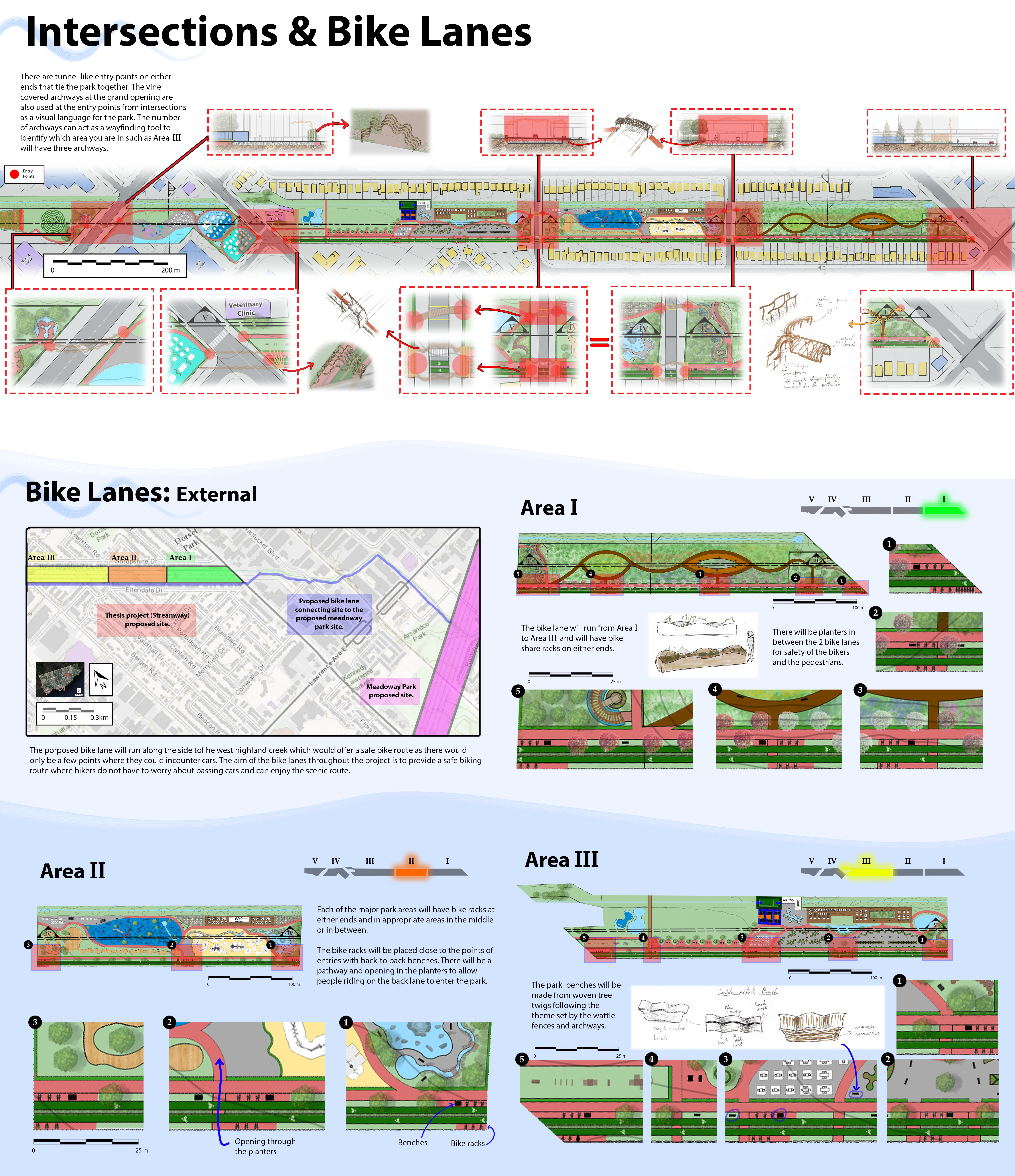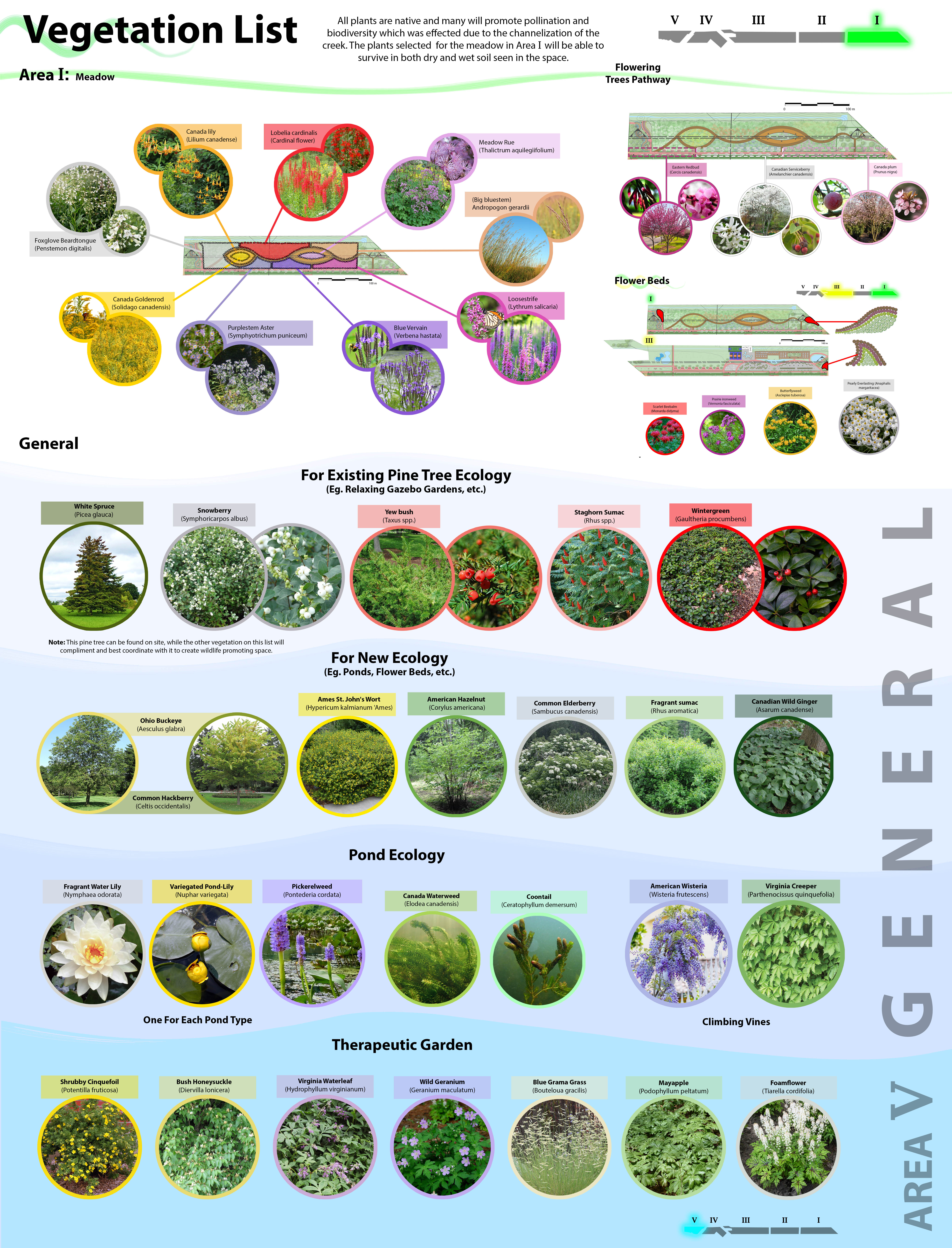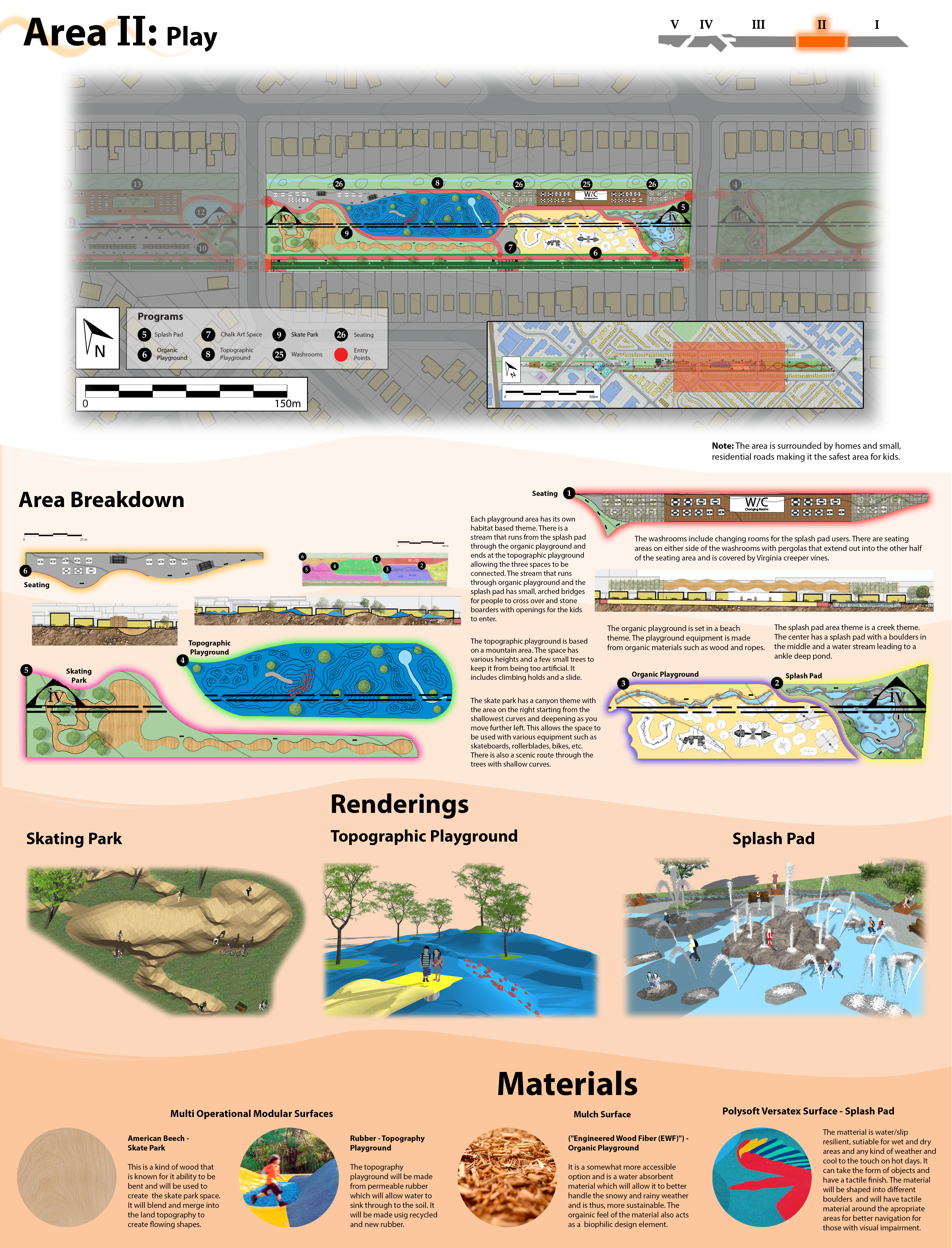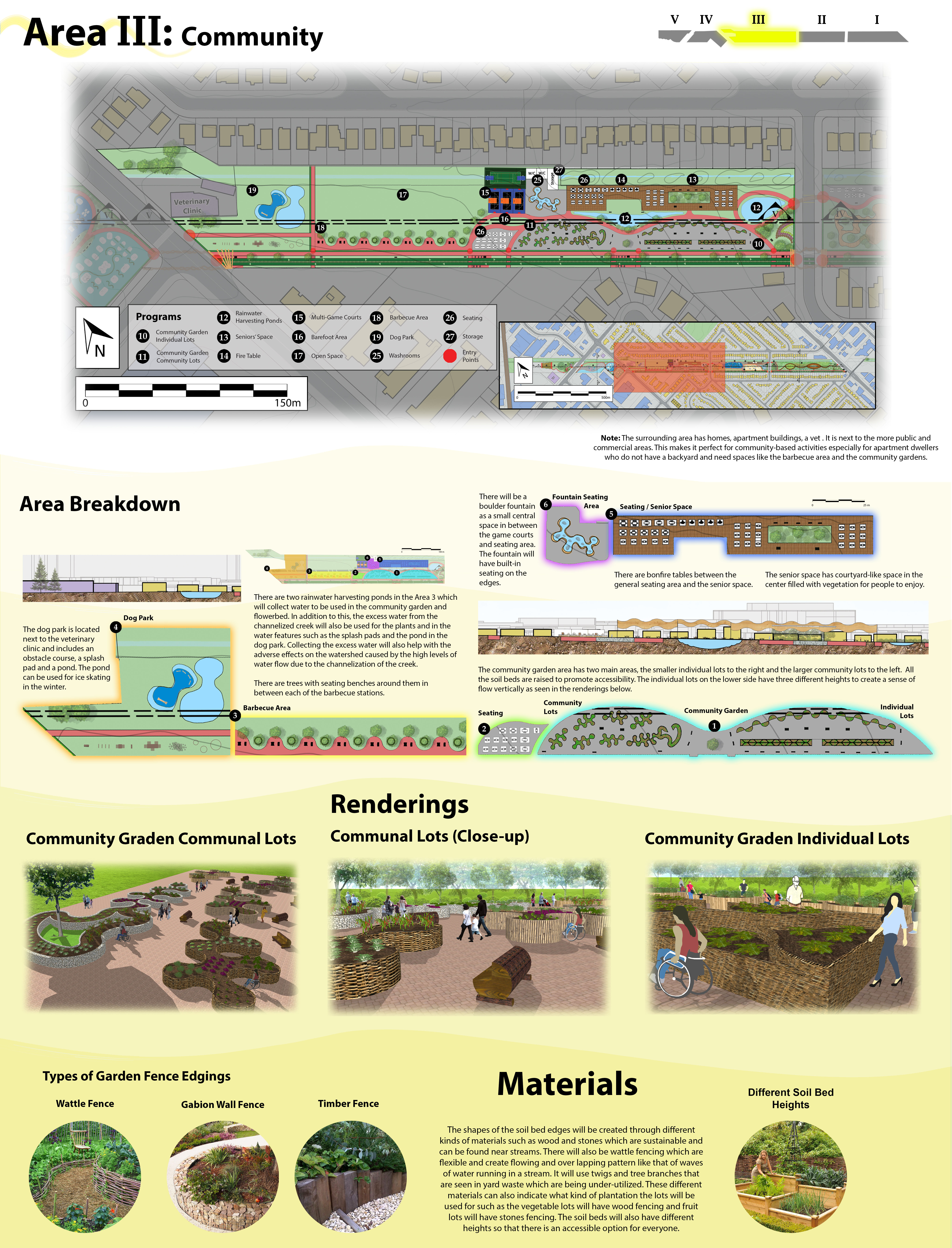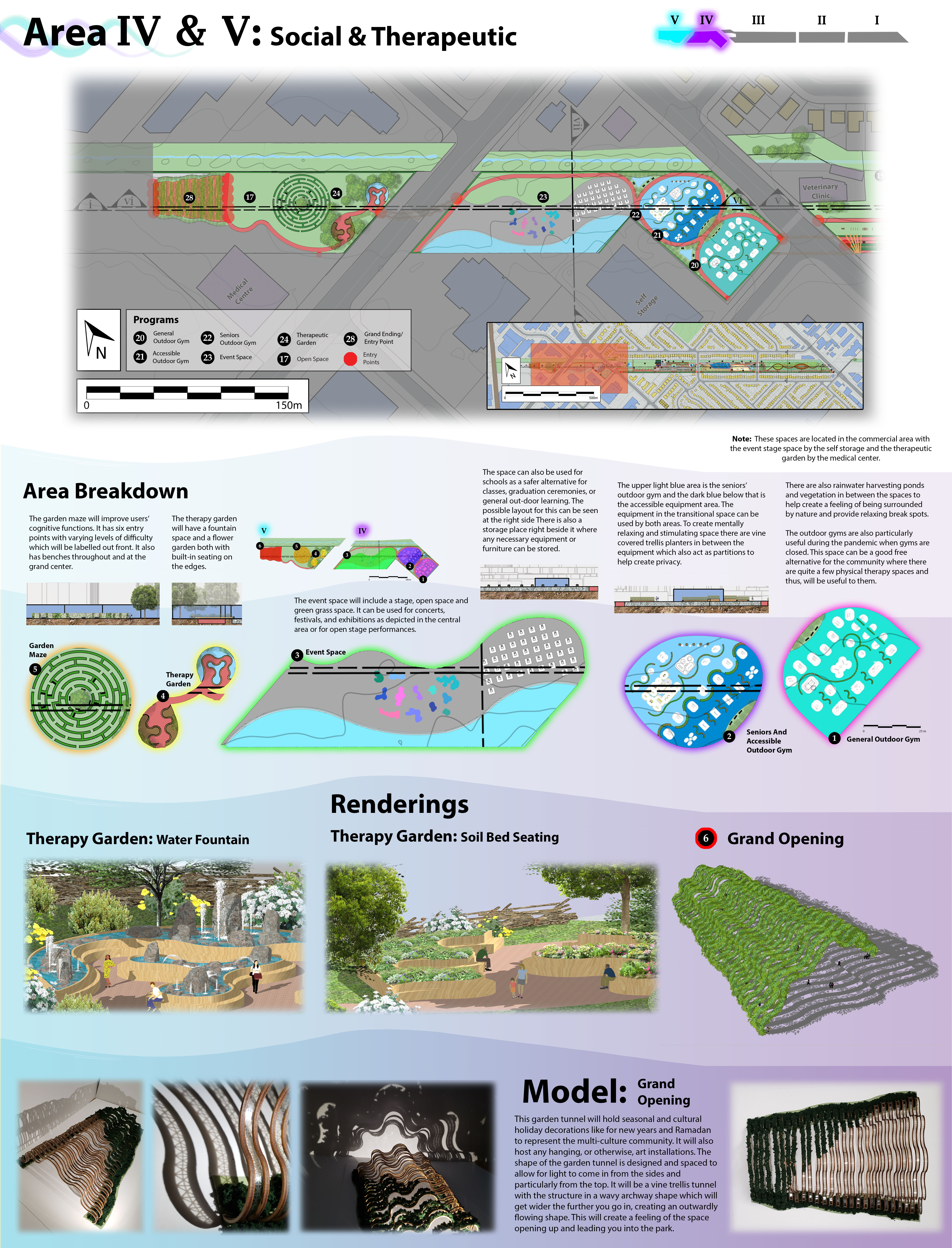 “Thesis Statement: Turning an under-utilized urban space into public parks using biophilia can be sustainable and improve people’s well-being. Revitalizing an under-utilized urban space into a linear park could take advantage of the space’s hidden potential to provide the community with a healthy space to enjoy especially since the events of the pandemic.Project Description:The project is located roughly in Scarborough’s Dorset Park neighbourhood and is about 1.7 km long and 225 m wide. It used to host hydro lines but currently consists of flat, empty green patches with no purpose or use with the space essentially being wasted. It has the West Highland Creek, partly channelized, running along side it from which I will be harvesting water during flood times. It also has a run-off area which acts as a seasonal wetland area. My concept is flow and metaphor is stream due to the site’s shape, the creek, and my desire to promote health and well-being of humans and the environment alike using biophilia and sustainability. This project will repair some of damage caused by the channelization by introducing vegetation that promotes biodiversity. There are also water harvesting ponds for watering near-by vegetation and permeable pathways for soil health.Since the events of the pandemic, the need to utilize our outdoor spaces for the sake of promoting our communities' well-being has become apparent. The proposed space will introduce nature’s ability to promote people’s mental well-being by reducing stress through a relaxing environment, promoting cognitive function by stimulating minds, and improving moods through the sensory experiences in nature. It also allows and encourages the community to connect with one another and promotes physical well-being through physical activities in and around nature. This will help alleviate some of the negative effects that the pandemic has had on people’s mental, physical, and communal health and well-being.Student Description:As someone interested in both urban design and landscapes, I want to design spaces that further introduce green spaces rather than destroy it through unnecessary pollution that hides behind claims of urbanization and development. Our projects should always have a net positive effect on our environments, and I believe that we can do that while still developing our cities and community resources.For the full booklet, please look under "view all works."”