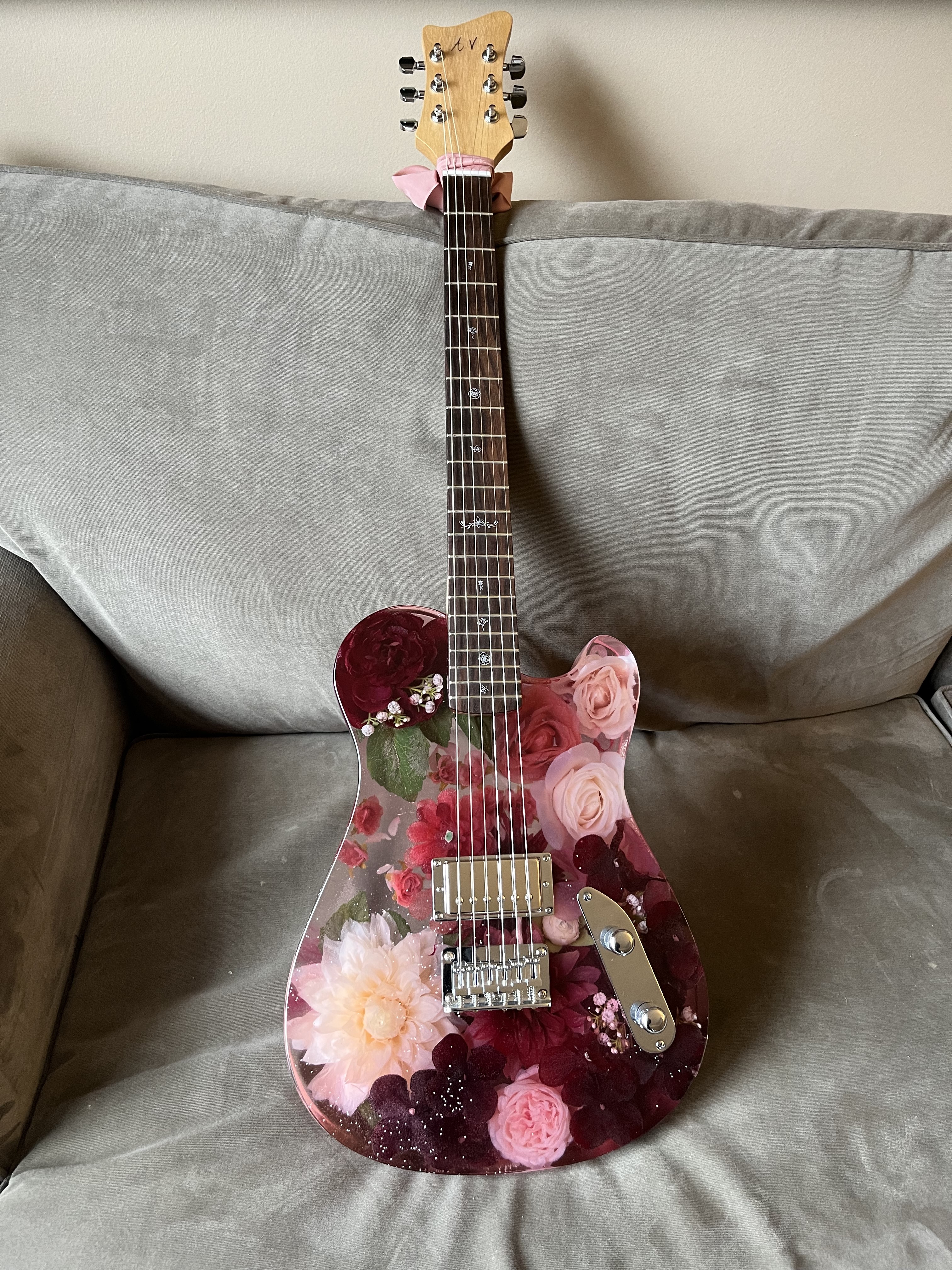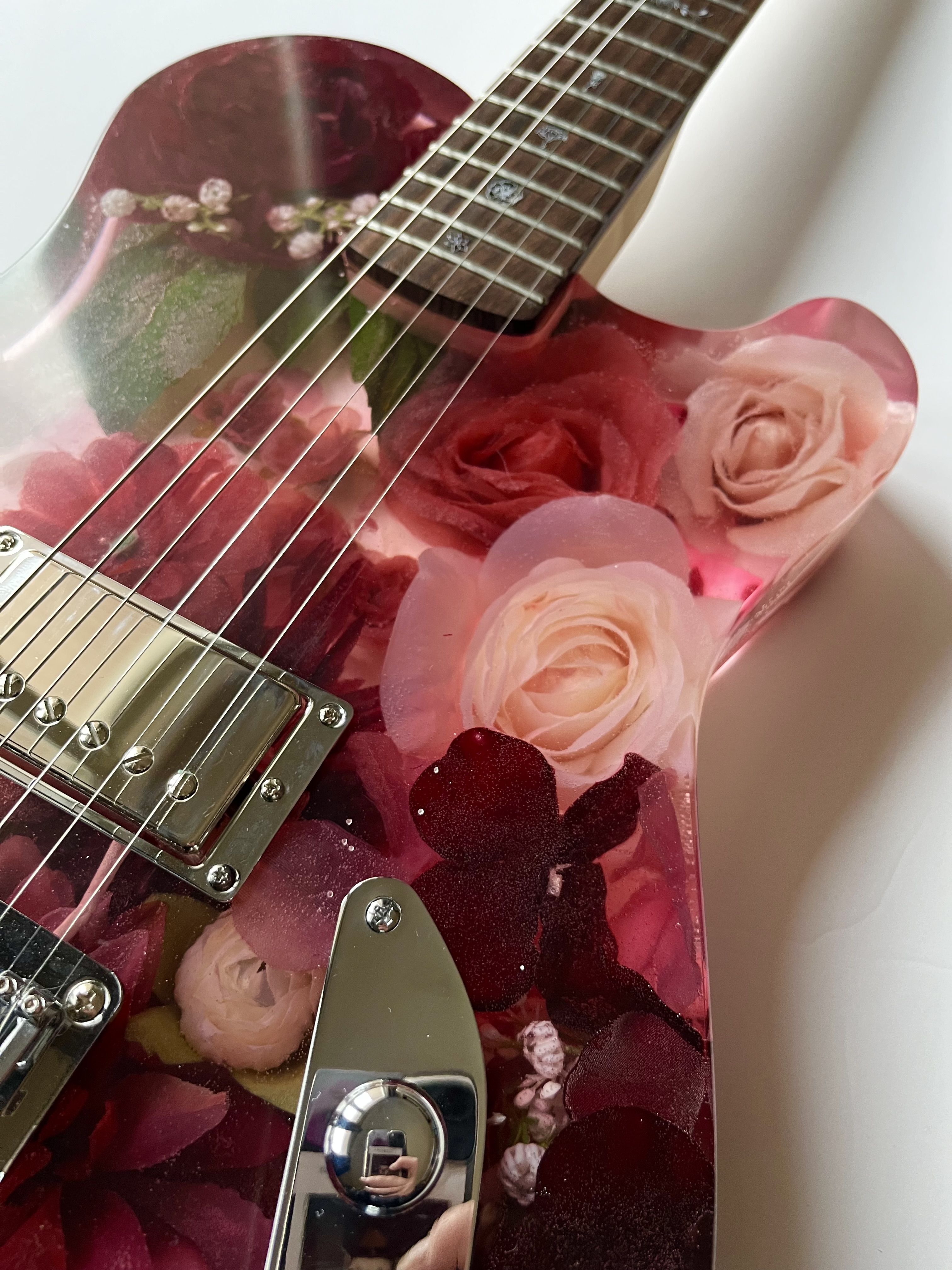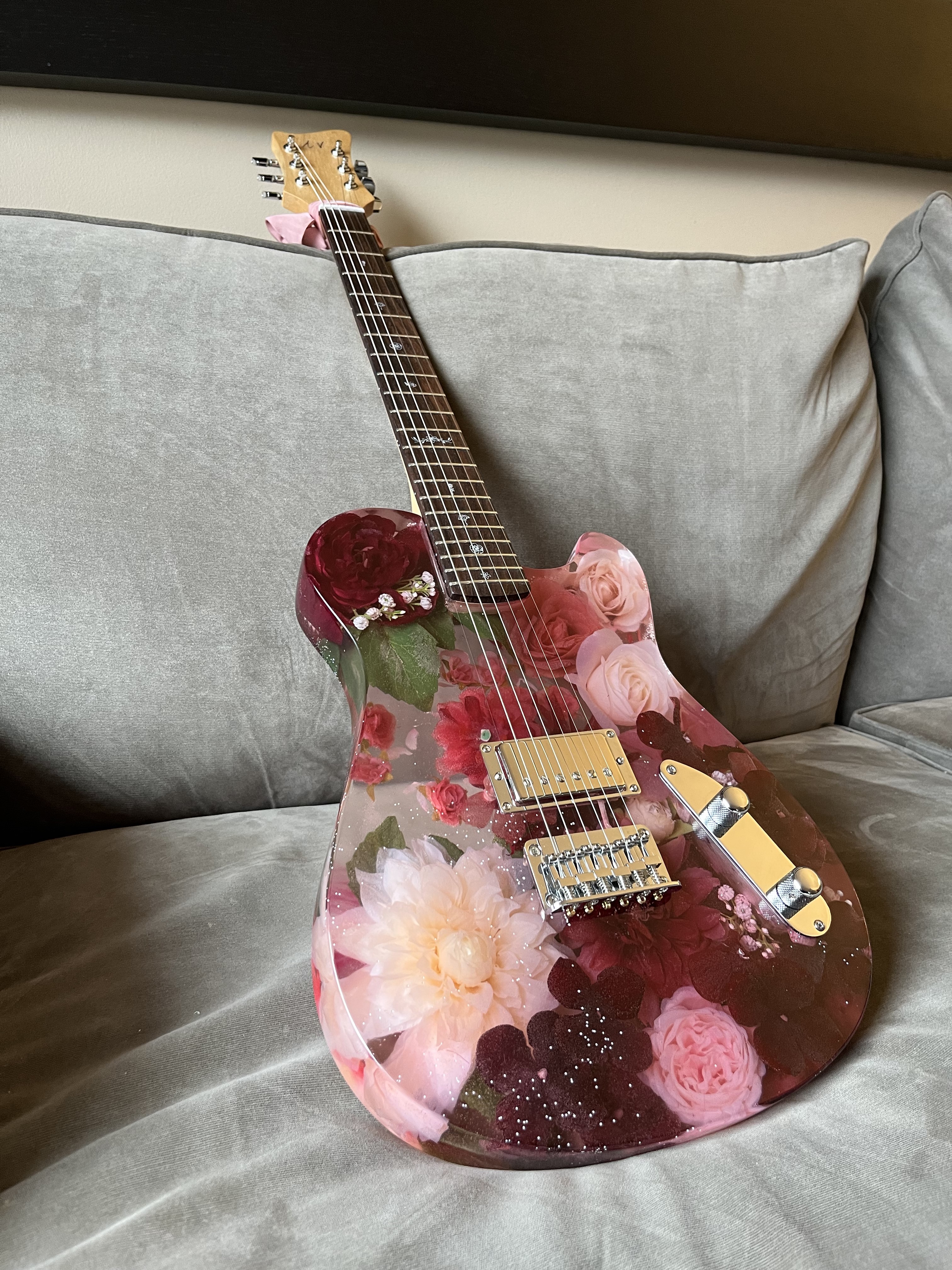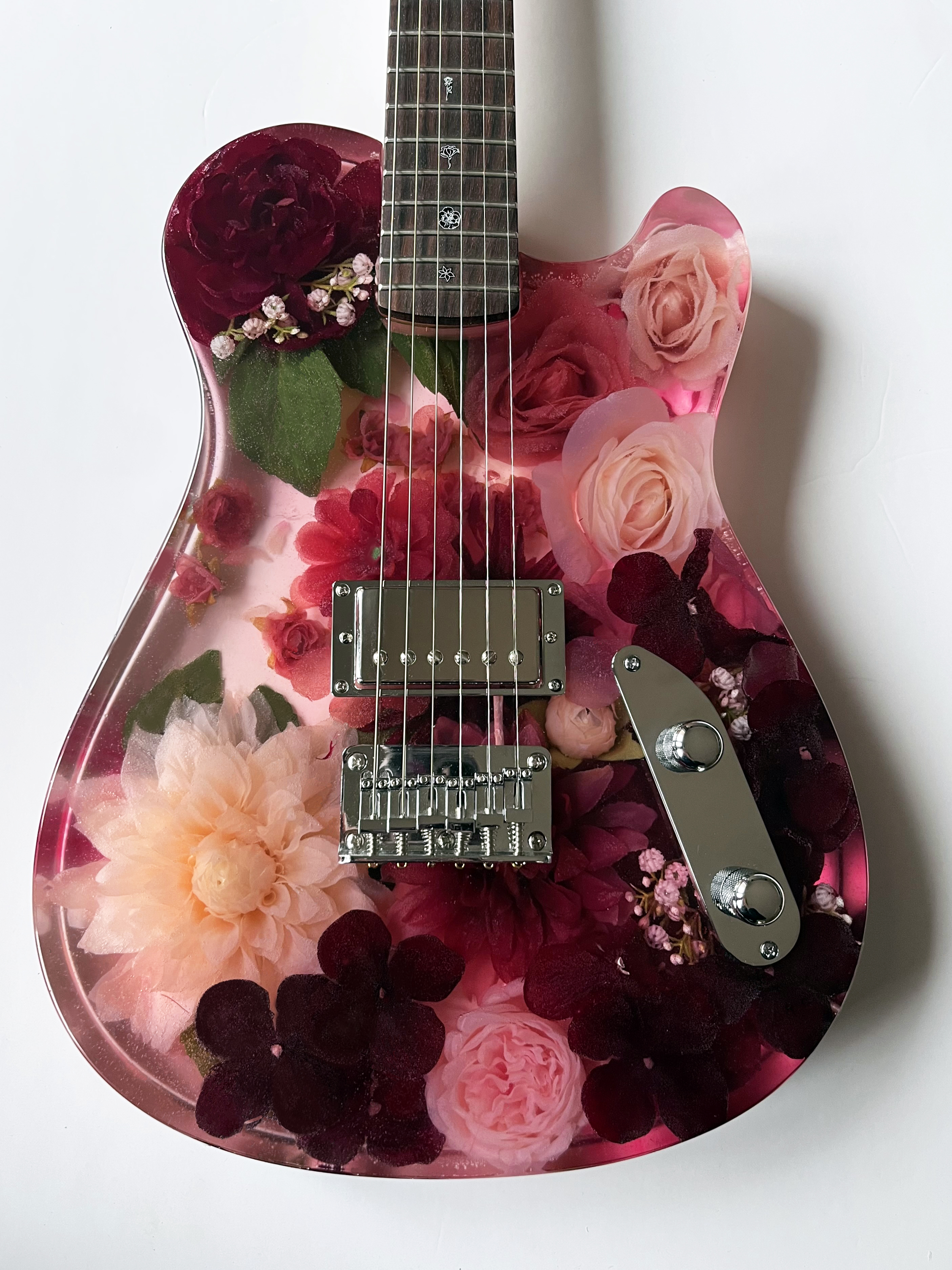 The Angela Rose Guitar is a one-of-a-kind electric guitar that stands out due to its unique design and striking visual appeal. The guitar is crafted from resin and features intricately embedded flowers that are suspended within its transparent body. This distinctive design makes the guitar not only a work of art, but also a fully functional instrument that produces excellent tone. The guitar's exceptional craftsmanship and aesthetics are a testament to the creativity and innovation that can be achieved in guitar design.The guitar's popularity has been further amplified by social media. In January 2023, a video showcasing the progress of the guitar body was posted on TikTok, quickly gaining over 2.2 million views and 440k likes in under a week. This viral video has helped to bring even more attention to the unique and captivating design of the Angela Rose Guitar.The guitar has also been chosen to be featured alongside a small handful of other pieces in Central Gallery. Located in Chinatown, downtown Toronto, the exhibition runs through April 2023. This is a significant achievement and a testament to the guitar's widespread admiration from millions around the globe.In terms of electronics and parts, the Angela Rose Guitar is equipped with a PAF 36th Anniversary Bridge Pickup, volume knob, push/pull tone knob, chrome hardtail bridge, chrome bass plate, chrome 3+3 tuners, and chrome pickup rings. These components ensure that the guitar not only looks good, but also delivers a high-quality sound and performance.In conclusion, the Angela Rose Guitar is a truly unique and visually stunning instrument that represents the pinnacle of creativity and innovation in guitar design. Its popularity on social media, as well as its inclusion in the Central Gallery exhibition, serve as a testament to the guitar's widespread appeal and admiration. With its exceptional craftsmanship and exceptional aesthetics, the Angela Rose Guitar is a true work of art that is also a fully functional and high-performing instrument.