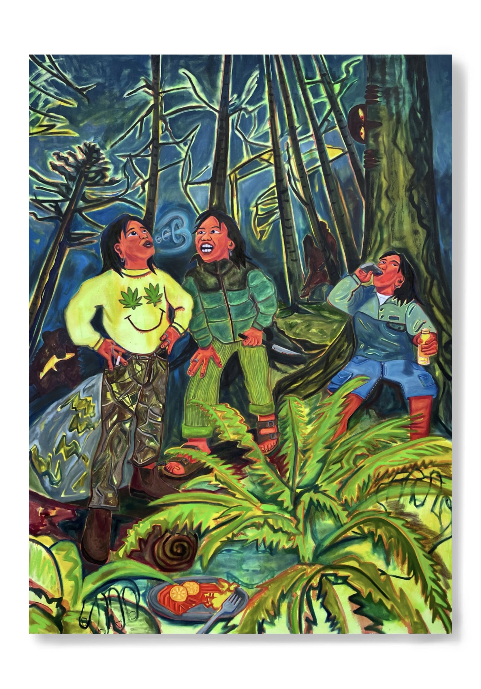 “Placed into a vibrant trickery of idyllic settings from childhood and adolescence, the large-scale paintings immerse the viewer into auto-ethnography. The depiction of Asian femmes taking up unsympathetic space are placed into the political landscape of the West Coast. I reference Jin Me Yoon’s work to understand and question who belongs when we have an “In-between” identity? The figures challenge the land they occupy, complicit yet troubled by the colonial land that they settle on. The Asian femme is faced with navigating the intersections of their identity, fluctuating between the oppressed and the oppressor. I reference and pay recognition to the influential Asian artists that come before me; Yue Minjun, Amanda Ba, Sasha Gordon, Jin Me Yoon, and Zeng Fanzhi. Transgressive, I personify the different aspects of the similar-statured figure to understand the historical context of Chinese culture and history critiquing the idea of the “liberated individual”. I bounce off Yue Minjun’s conceptual use of duplicated selves and exaggerated facial expressions.”
