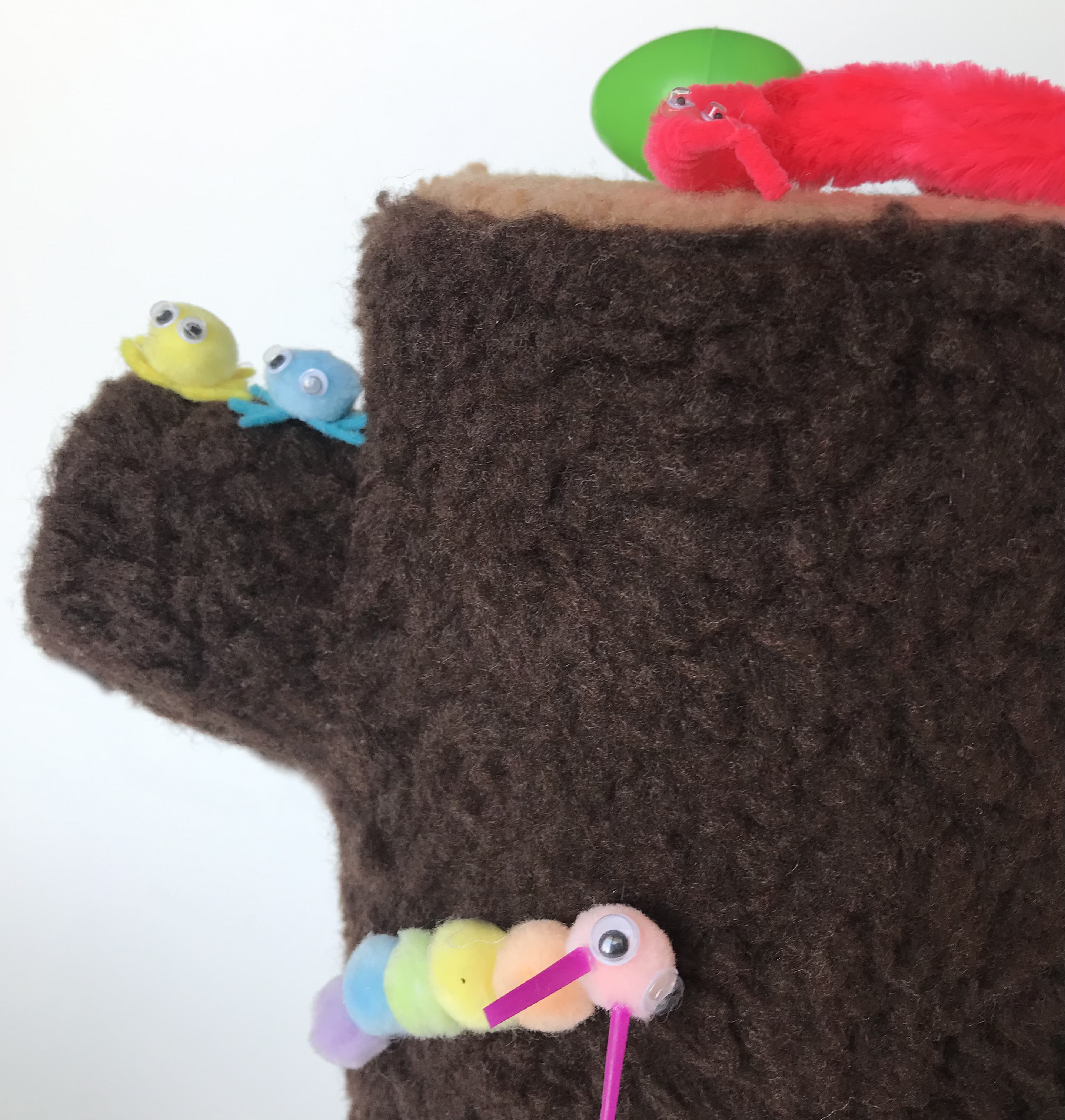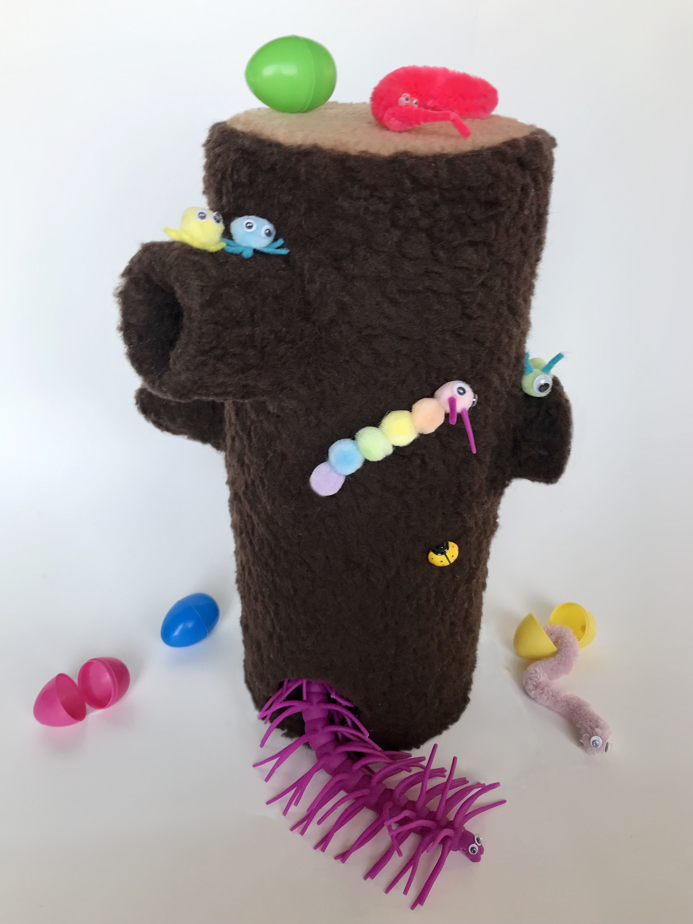 Bug Log is a nature-inspired STEM toy offering open-ended play with an element of surprise, specifically designed for children ages three and up. The plush log contains several branches that, when manipulated through pressing, pulling, or twisting, can cause an egg to pop out from one of the many holes on the log. Inside each egg, there is a different toy bug that can be played with on the log. After playing with the bug, the child can return it to the egg and send it "home" by returning the egg through one of the branches with a chute.Bug Log helps young children (ages 3-5) to reach cognitive and social developmental milestones, as it can be used as an aid in naming colours, learning to count, sharing, and manipulating objects. It encourages creativity through its open-ended play, and it's bright colours, soft materials, and different textures offer sensory stimulants. Bug Log is relevant in today’s day and age as it is a green toy which encourages an interest nature in children and can lead to conversations about topics such as sustainability. This is especially important today with climate change, and Bug Log can be used as a tool to start conversations about it early on in a child’s life.