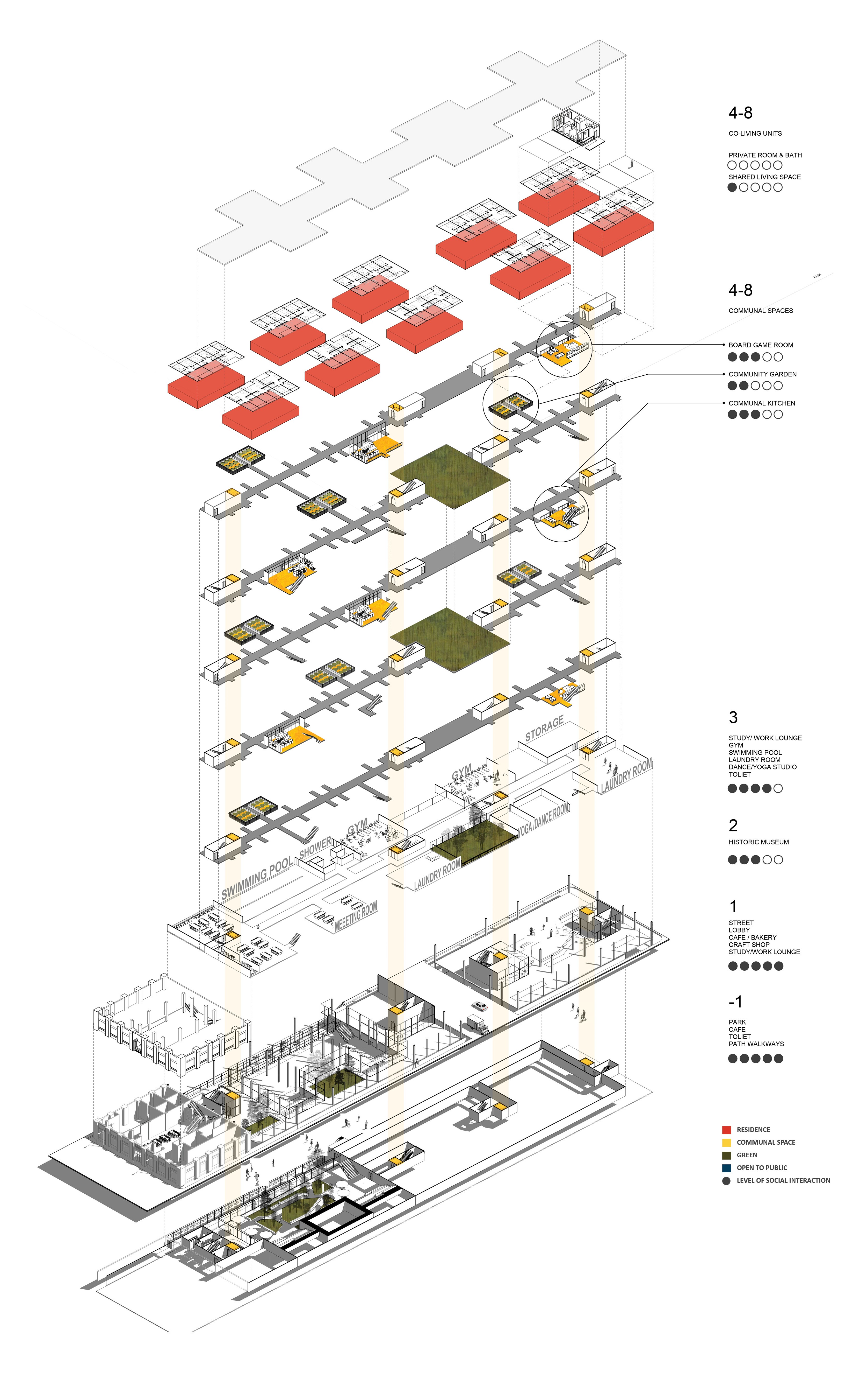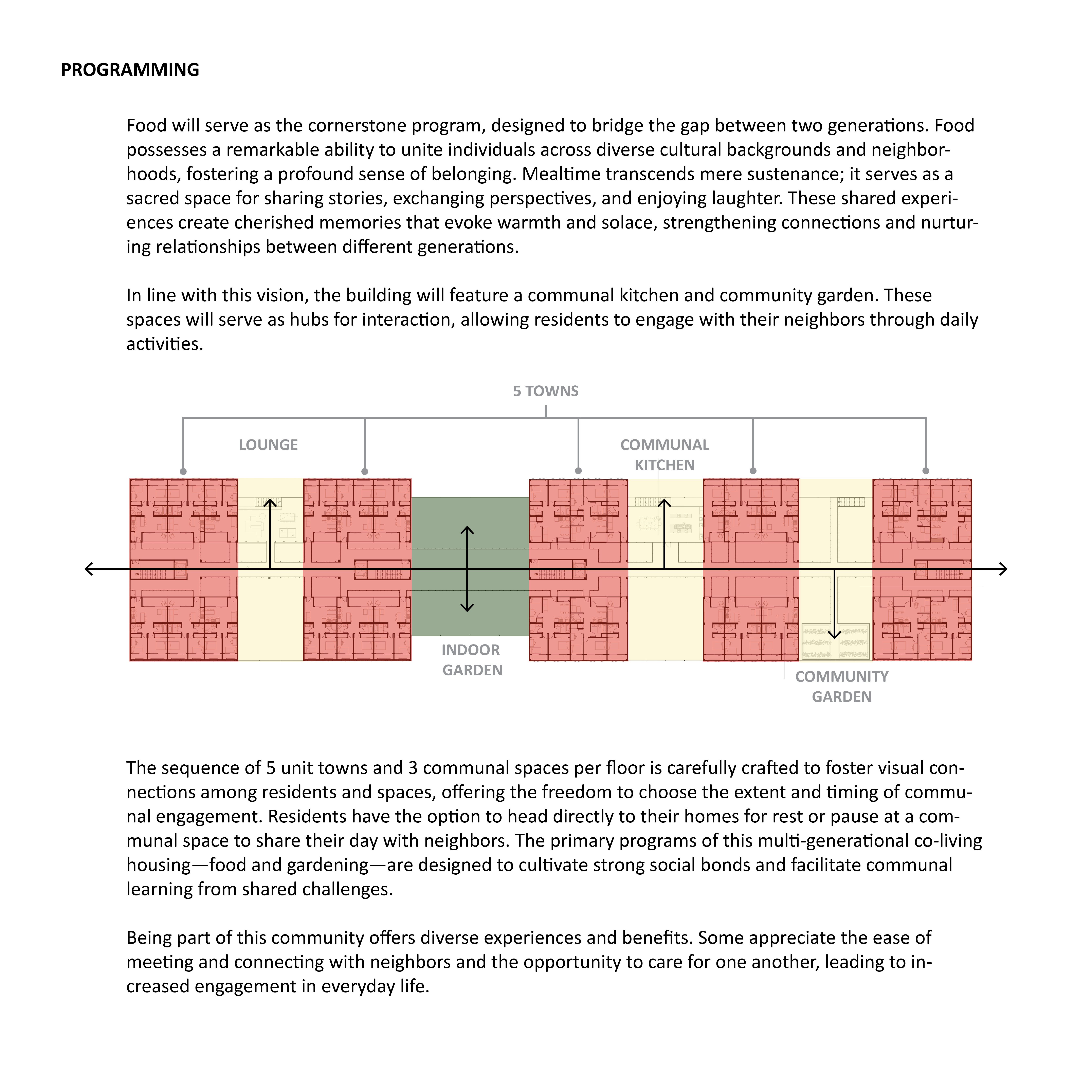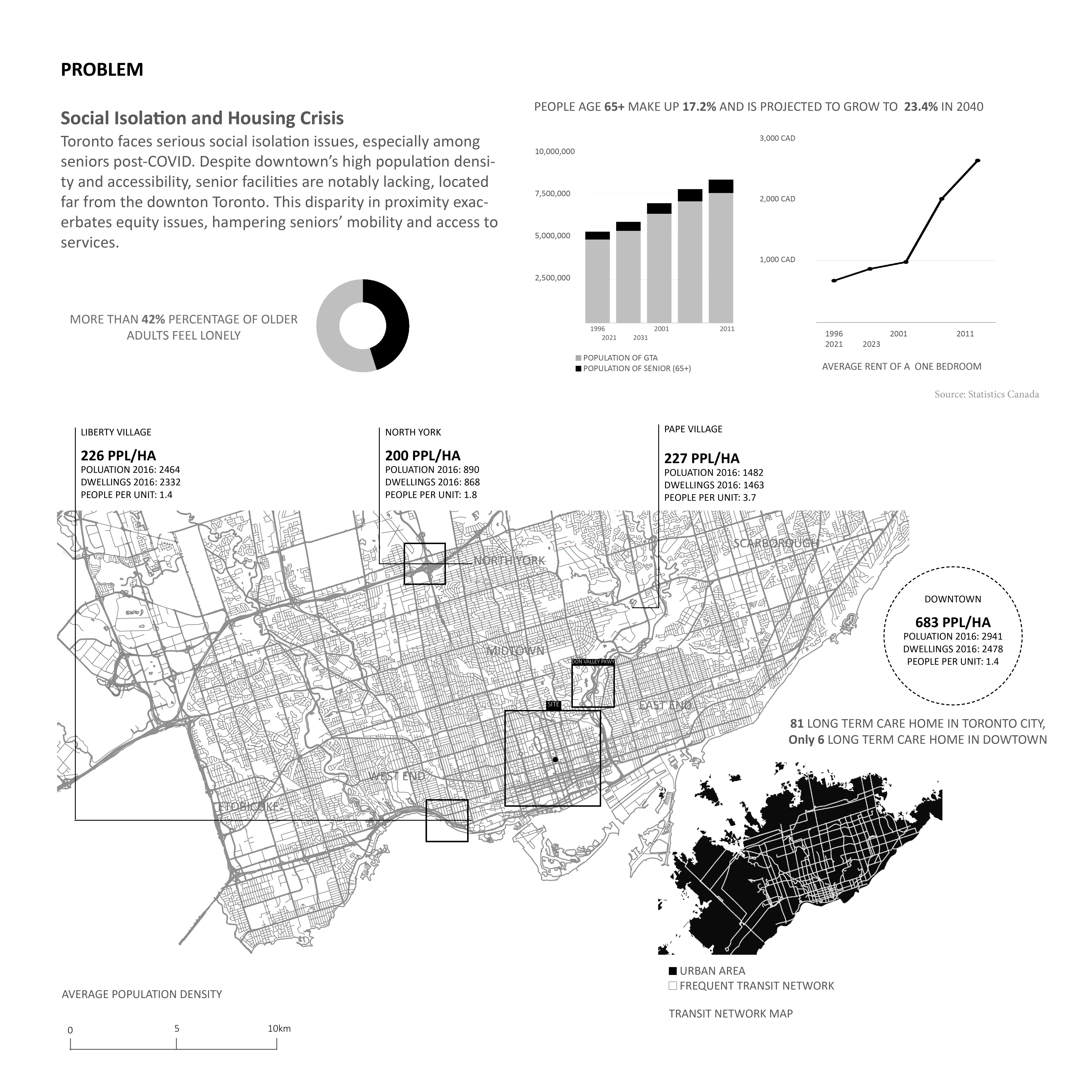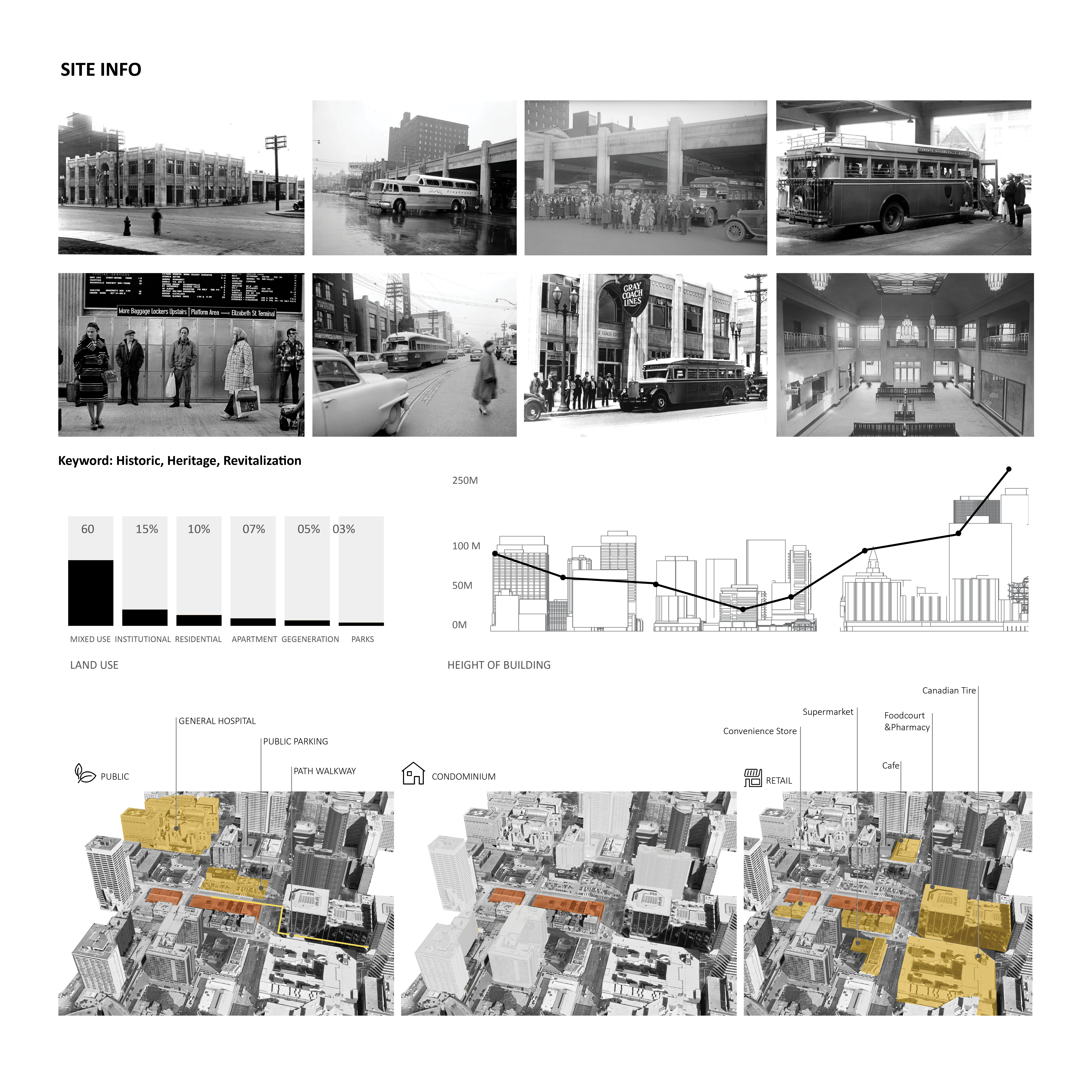 “As human lifespans extend globally, the challenge of aging has become increasingly apparent. Nowhere is this more evident than in Toronto, Canada, where rapid social changes among diverse cultural groups have intensified intergenerational conflicts and deepened the isolation of older adults. Contemporary societal norms often lead to the separation of different age groups into distinct spaces, driven primarily by functional considerations. This trend extends beyond residential facilities, permeating cultural, educational, and community spaces, inadvertently exacerbating tensions between generations.In response to this pressing issue, this architecture practice is pioneering a solution: transforming the historic Toronto Old Coach Bus Terminal into a multi-generational co-living residence. This architectural initiative seeks to revitalize the diminishing importance of intergenerational exchange. Its core objective is to elevate the quality of living environment for the elderly by addressing the pressing housing and educational needs of the younger generation, who find themselves at opposite ends of the life cycle.”