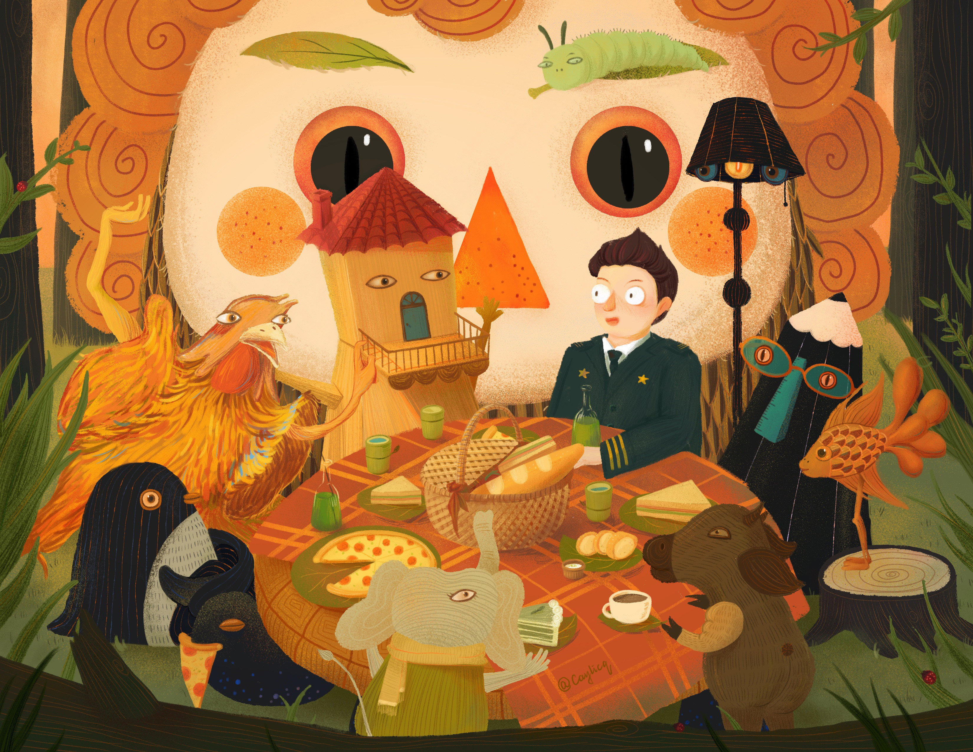 A pilot unintentionally lands in the world of Max Ernst's artwork. At here, there are many strange creatures, so everyone gathers for a picnic to share their stories.