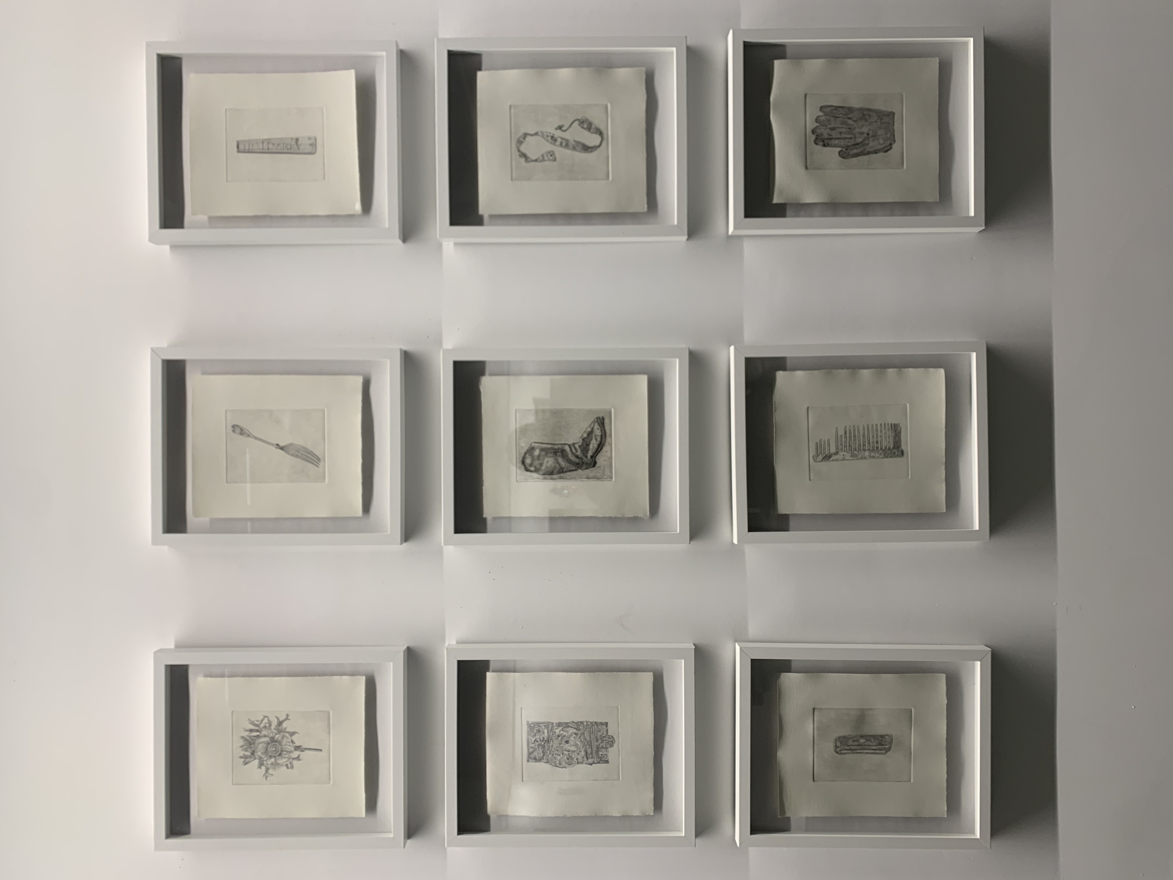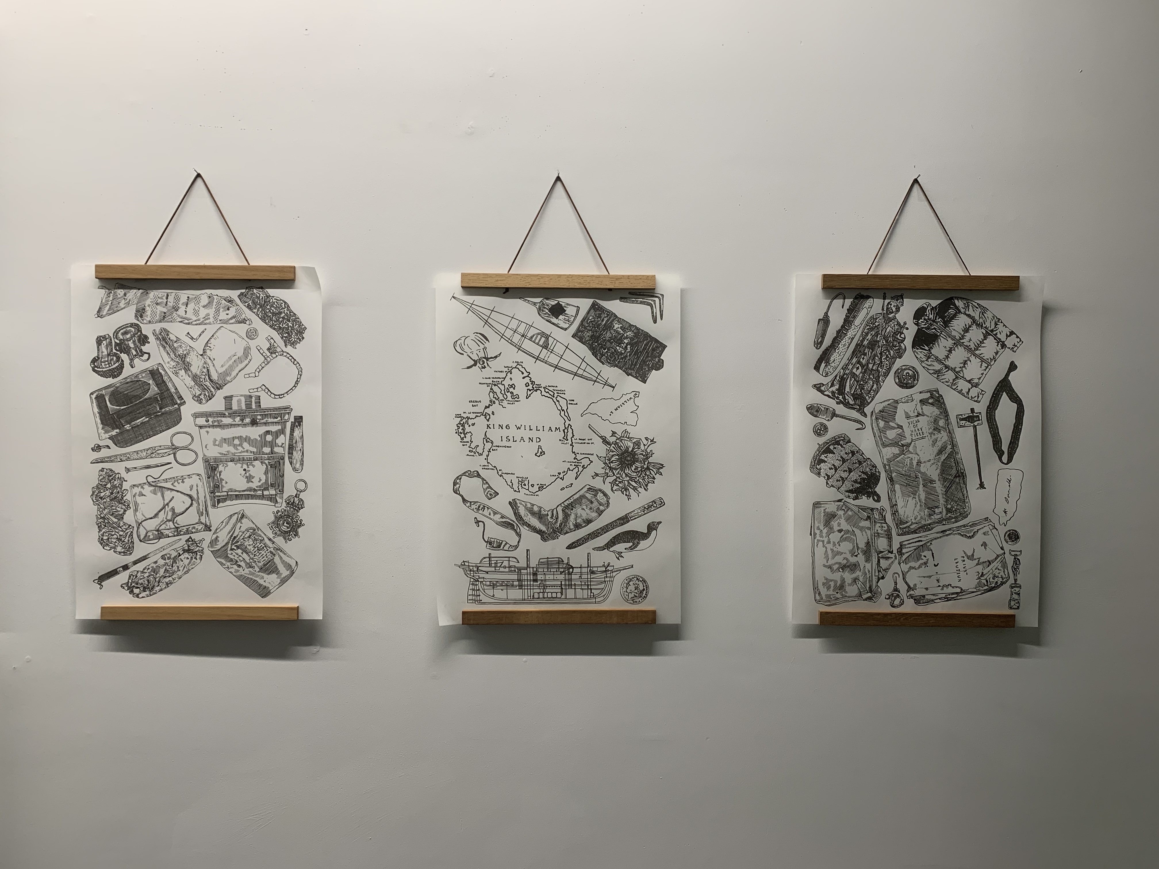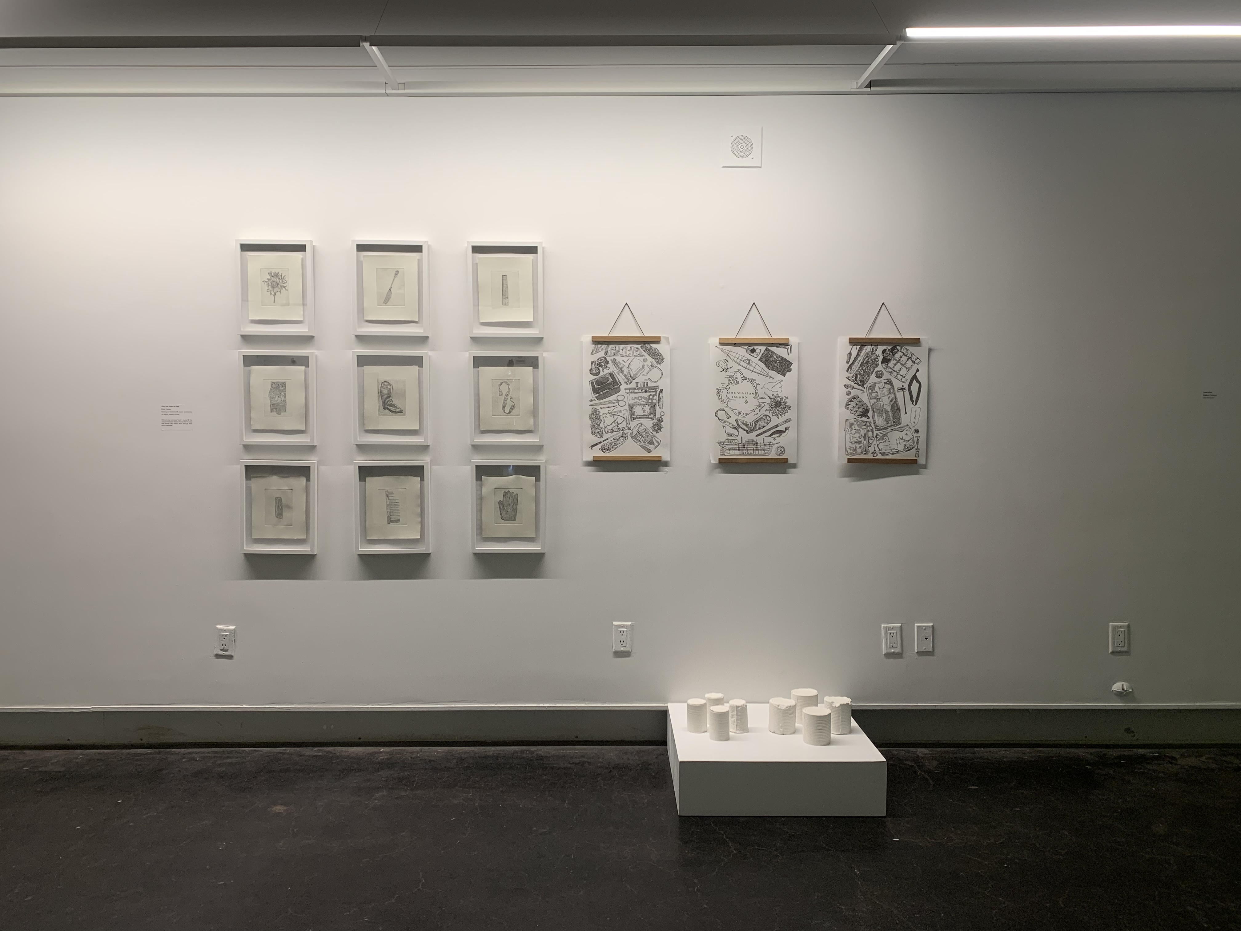 “The Franklin Expedition disappeared 177 years ago, leaving behind nothing but mountains of relics and a few cryptic notes. Since then it has become the topic of myths and speculative narratives of myriad cultures including Inuit, British, and Settler Canadian. These myths often seem to exist in tension with the very real objects that remain and the individuals that they clearly evoke, floating diaphanously in the ether while these relics remain solidly tied to the people who possessed them. This project is an attempt to explore that tension as well as the myths and relics that comprise it through a series of small, detailed etchings, larger screen-prints, and plaster moulds. The stories that surround this expedition can be used a lens through which to examine questions of colonization, complicity, gender, and the construction of a settler state; the objects themselves only speak of individuals and the horror that befell them.”