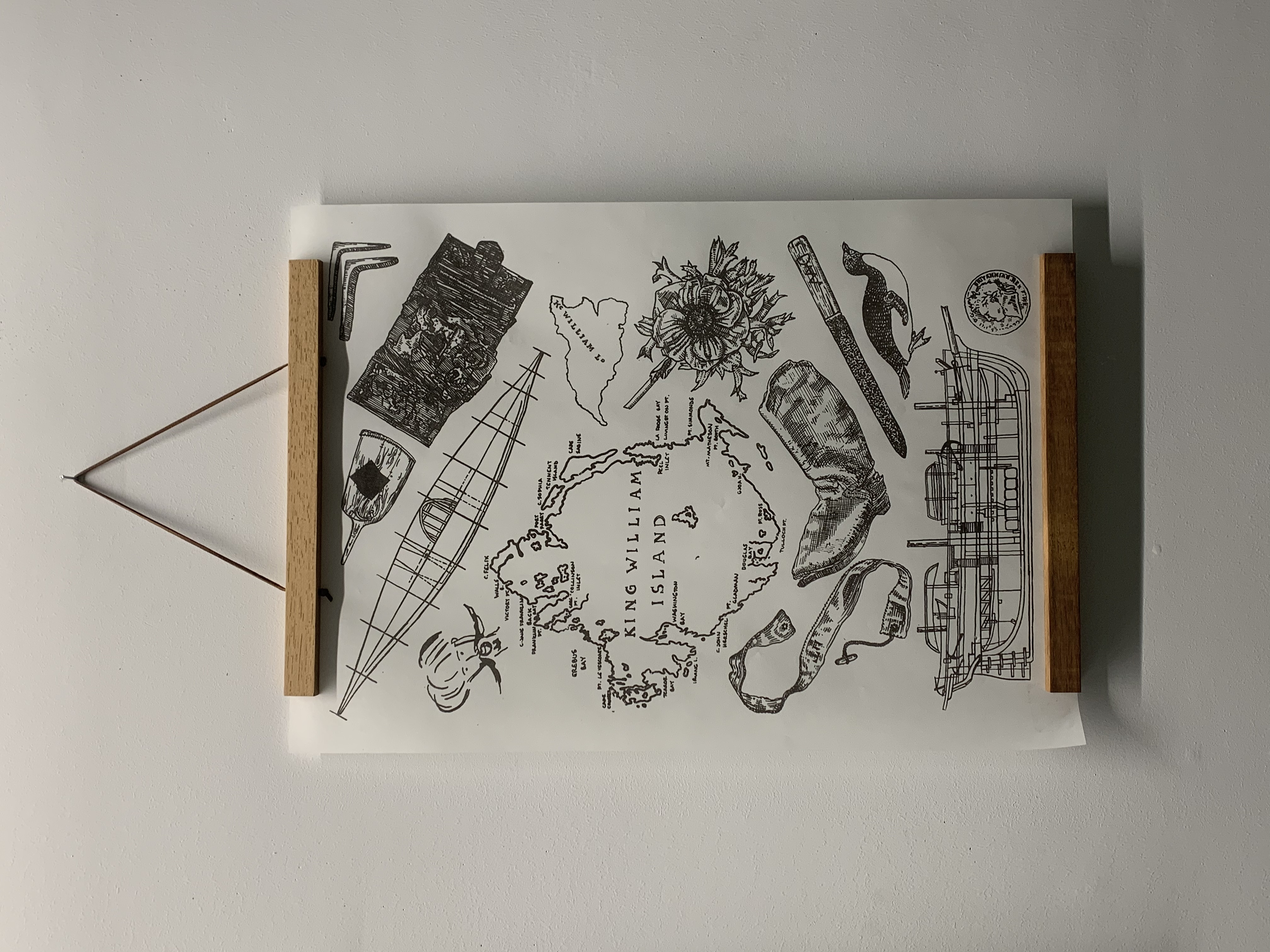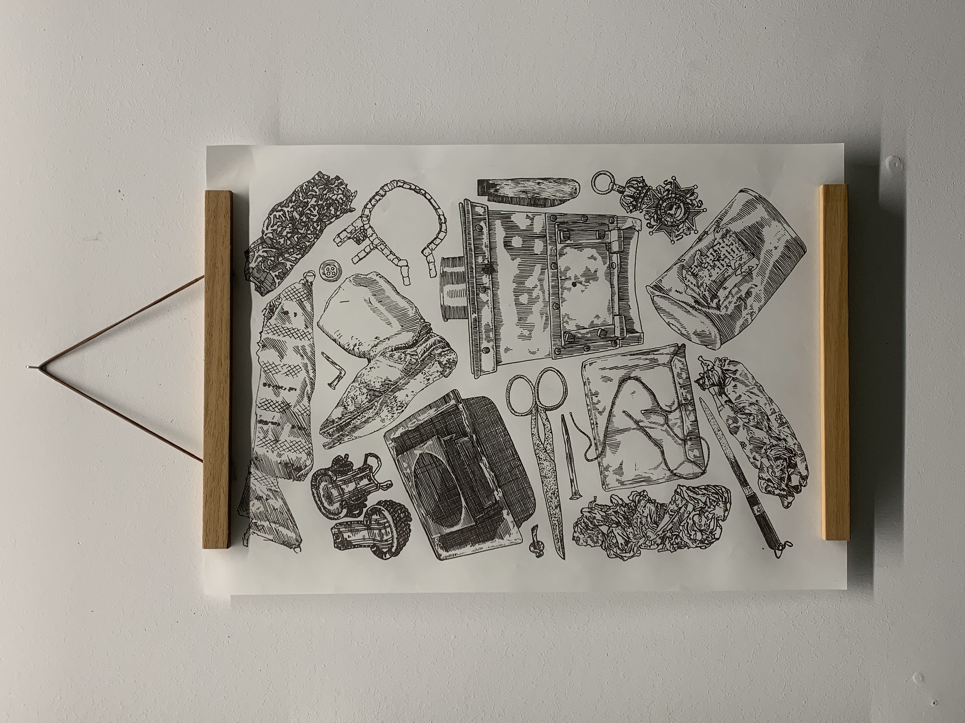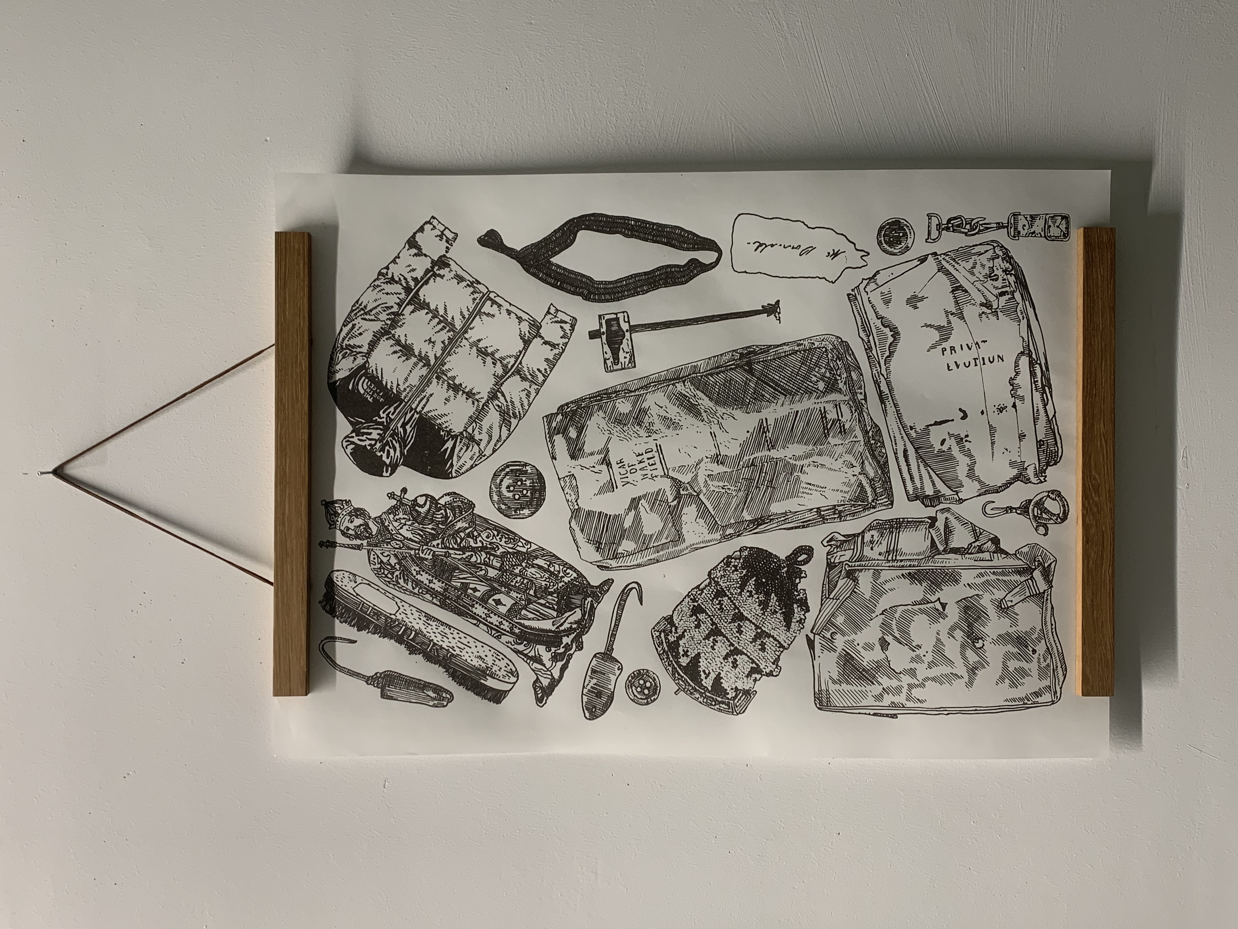 “The Franklin Expedition disappeared 177 years ago, leaving behind nothing but mountains of relics and a few cryptic notes. Since then it has become the topic of myths and speculative narratives of myriad cultures including Inuit, British, and Settler Canadian. These myths often seem to exist in tension with the very real objects that remain and the individuals that they clearly evoke, floating diaphanously in the ether while these relics remain solidly tied to the people who possessed them. This project is an attempt to explore that tension as well as the myths and relics that comprise it through a series of small, detailed etchings, larger screen-prints, and plaster moulds. The stories that surround this expedition can be used a lens through which to examine questions of colonization, complicity, gender, and the construction of a settler state; the objects themselves only speak of individuals and the horror that befell them.”