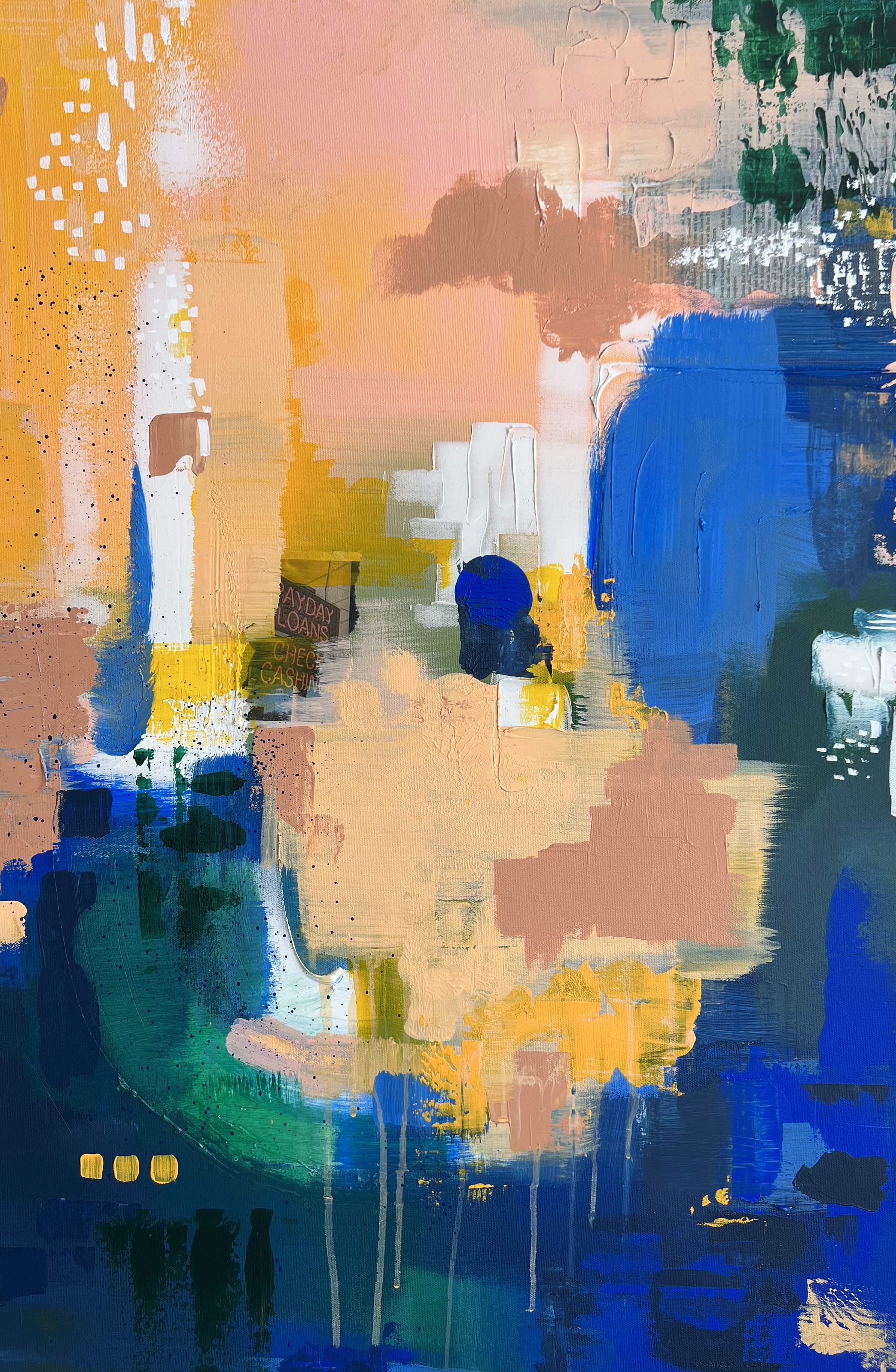"Brighter Day" captures the sensation of feeling content within our surroundings. The interplay of light and dark colours creates a sense of balance and harmony, while the textures evoke a feeling of depth and growth. Through this piece, I aim to celebrate the transformative power of finding peace and happiness within our own personal development along with the world around us.