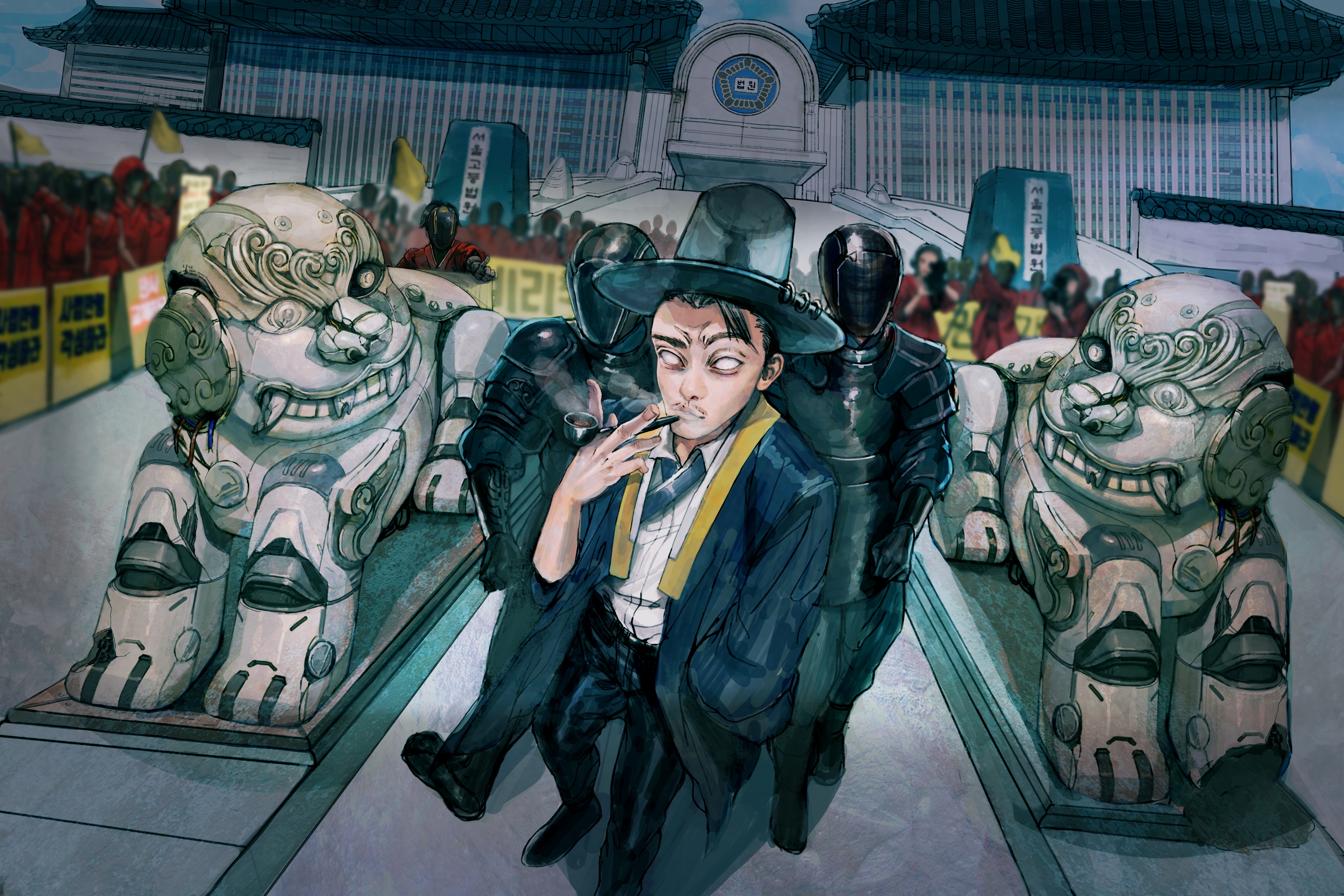 “Hae-tae is an imaginary animal in the ancient legend of East Asia and a symbol of justice. It is believed that with its own innate power, It is believed to distinguish between good and evil and punish corrupt officials. Just as the rule of law was ineffective in the Joseon Dynasty, all kinds of legal privileges and amnesty are granted to the Establishment in modern days. This illustration depicts a figure of the privileged class leaving the court without any legal punishment. The broken statue of Hae-tae is next to it as a metaphor for the breakdown of social justice.”