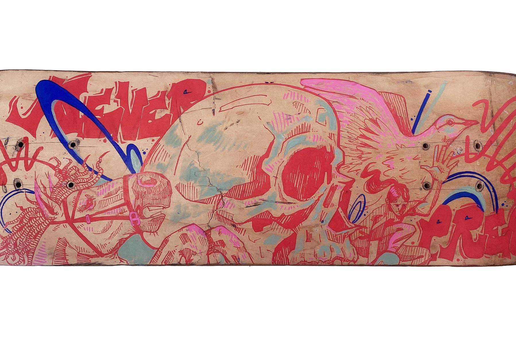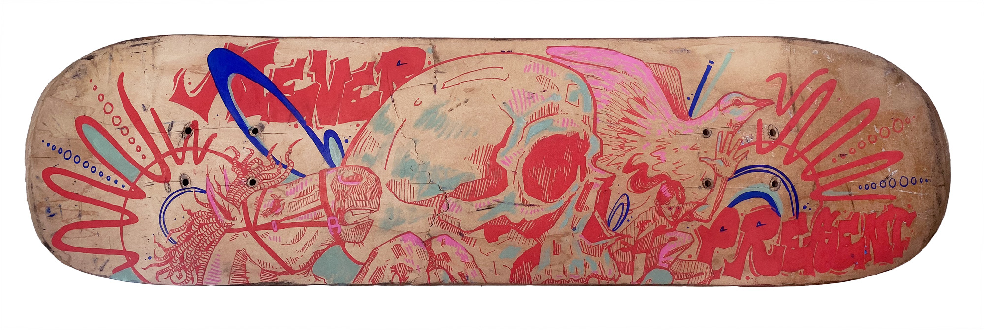Skateboarding is a unique form of movement that has been around for decades, and the culture surrounding it has a very nostalgic quality. Creating a worn-out deck that represents all the scrapes and falls one takes while skating while designing it like a continuous overlapped doodle, emulates the sense of longevity and memory that an item can hold for someone.