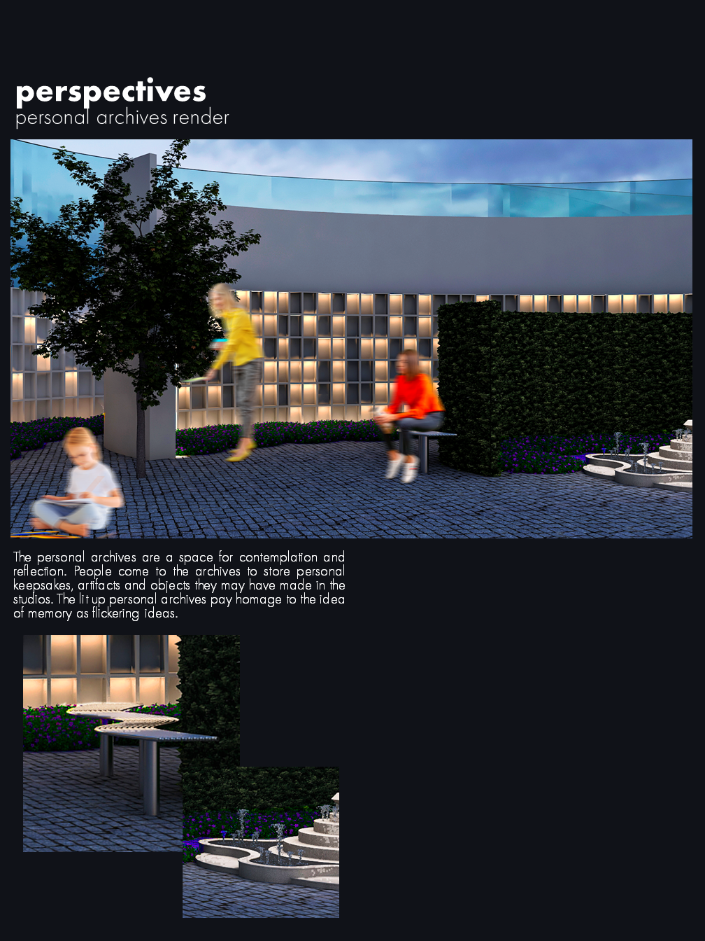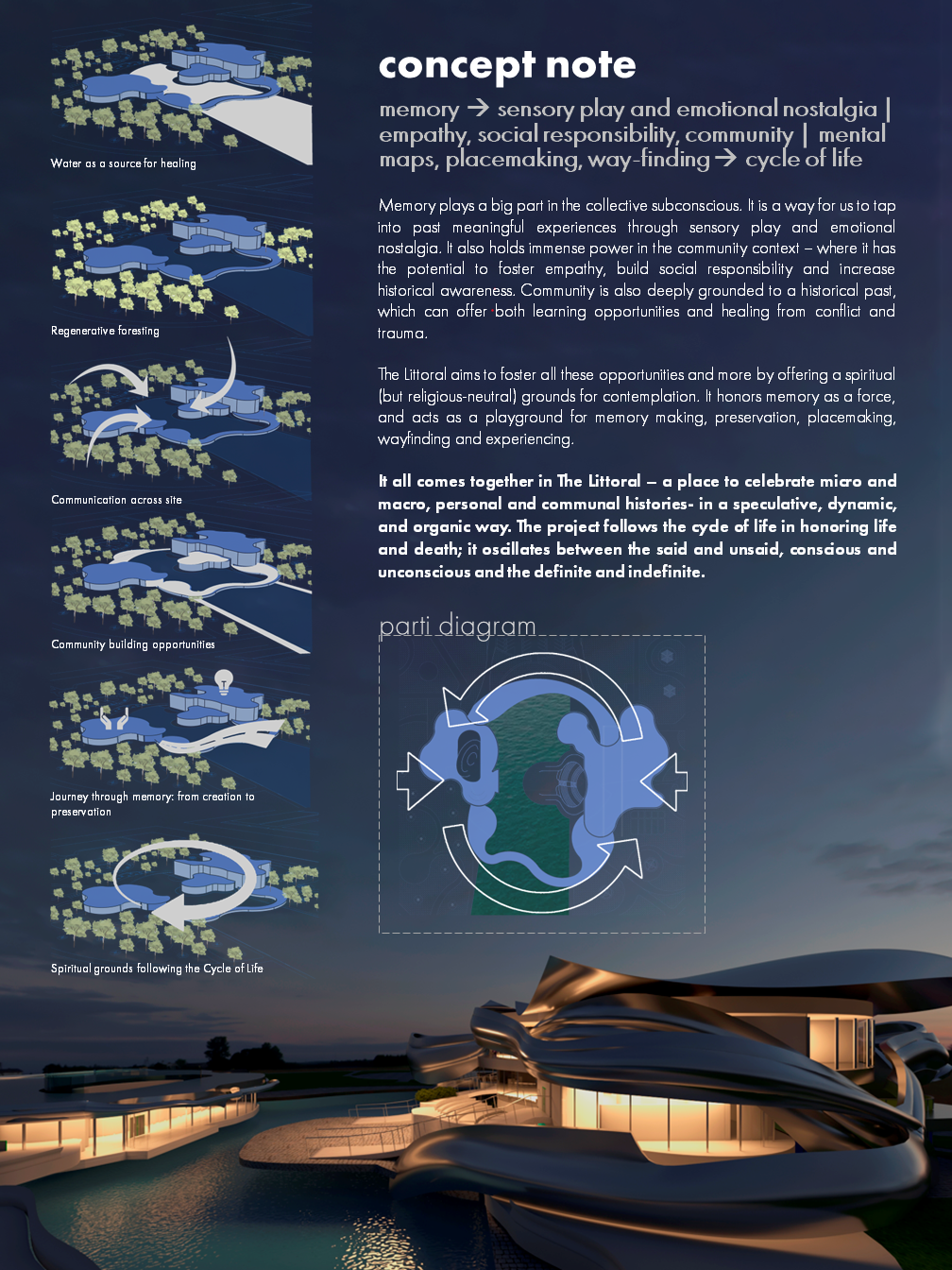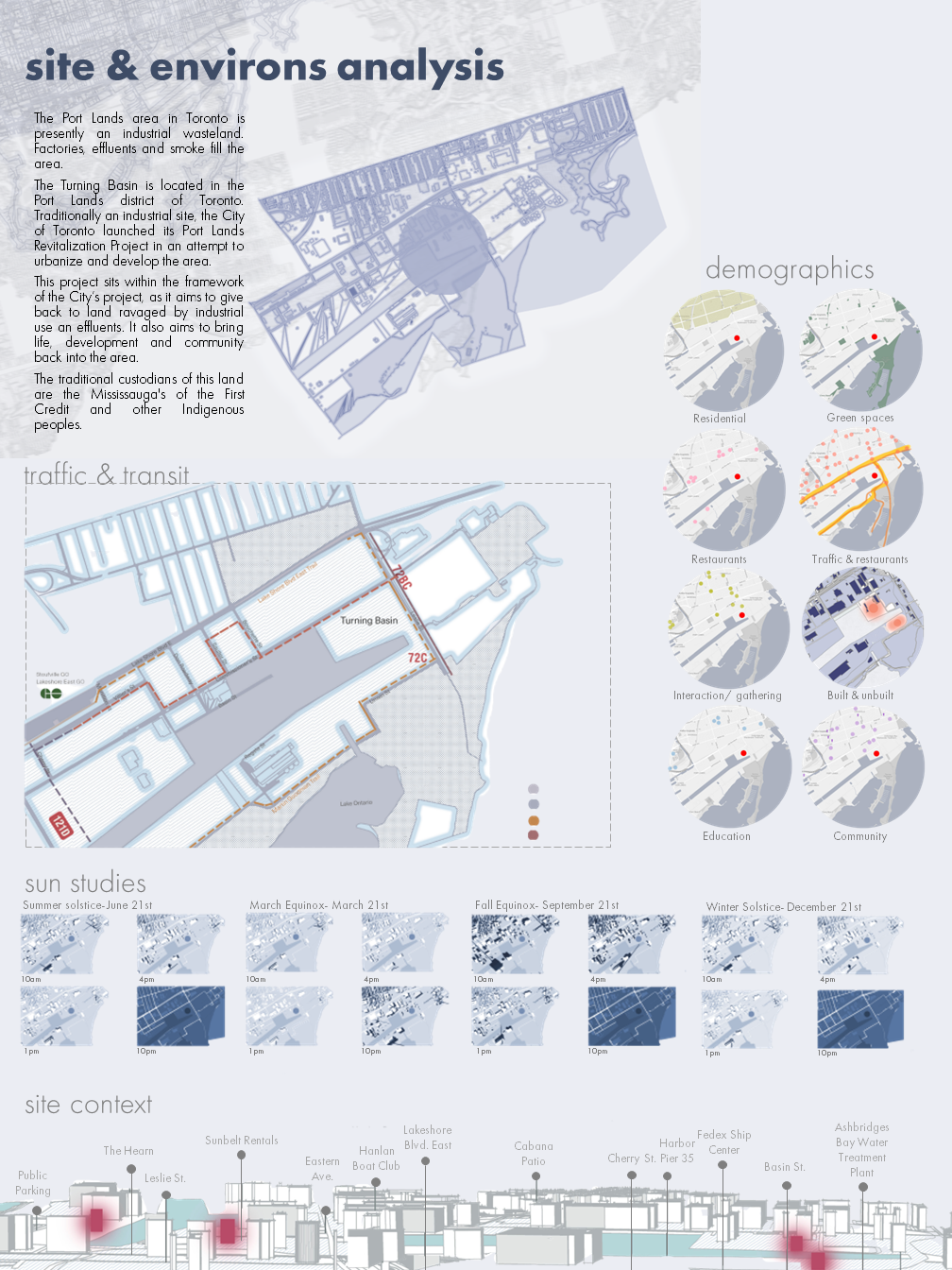 ThesisCommunity empathy, historical awareness and social responsibility can be expanded, enhanced, and supported by the use of commemorative projects in spatial design. ProjectMy project aims to achieve this through the creation of a community center that offers placemaking and memory creation, commemoration and preservation opportunities. It does this through a range of landscape, archiving, studio and gallery programs, while contributing to the City's Port Lands Revitalization project. Design ObjectivesMy design objectives for this project include: - Providing spiritual (but religious-neutral) grounds for community bonding - Offering a variety of options for people to preserve and look back on both everyday and larger personal and socio-historic events - Fostering empathy and social awareness for events of the past and offering opportunities to learn from micro and macro historiesCreating space for contemplation, reflection, nostalgia, and gathering