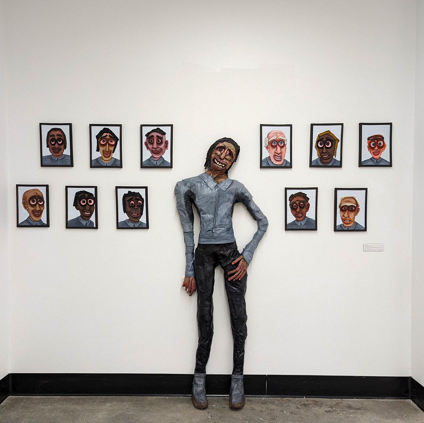 ““Employee of the Month” combines elements of painting and sculpture to create a humorous yet insidious installation. Mary Page unpacks grievances with corporate greed and the expectations of the worker, while drawing inspiration from personal experience in retail and customer service. Caught in a moment between tasks, the main figure poses for a picture honouring their hard-earned achievement of employee of the month. They are joined by the desperate, distressed portraits of others like them. In a world where “grind culture” encourages people to abandon personal and emotional desires for a hard days' work while employers offer insufficient compensation for such, “Employee of the Month” seeks to start a conversation about why we’re willing to work ourselves to death? ”