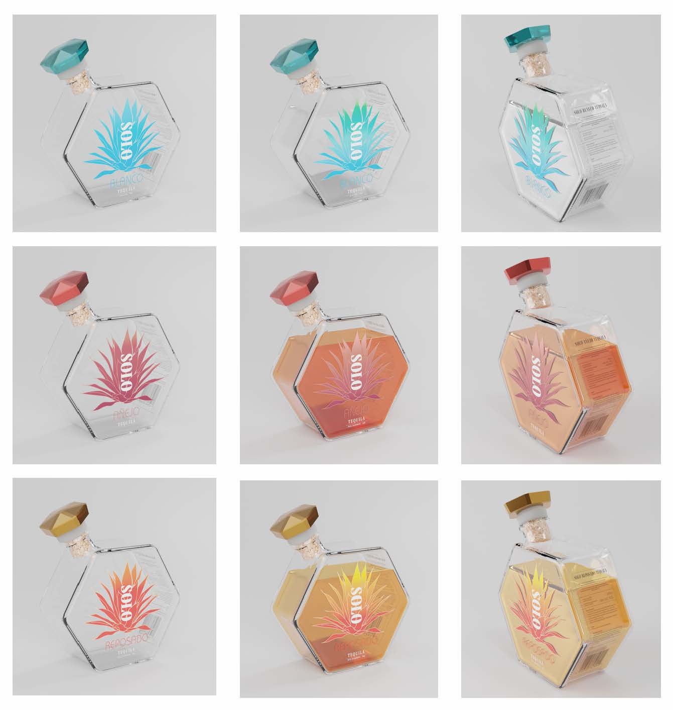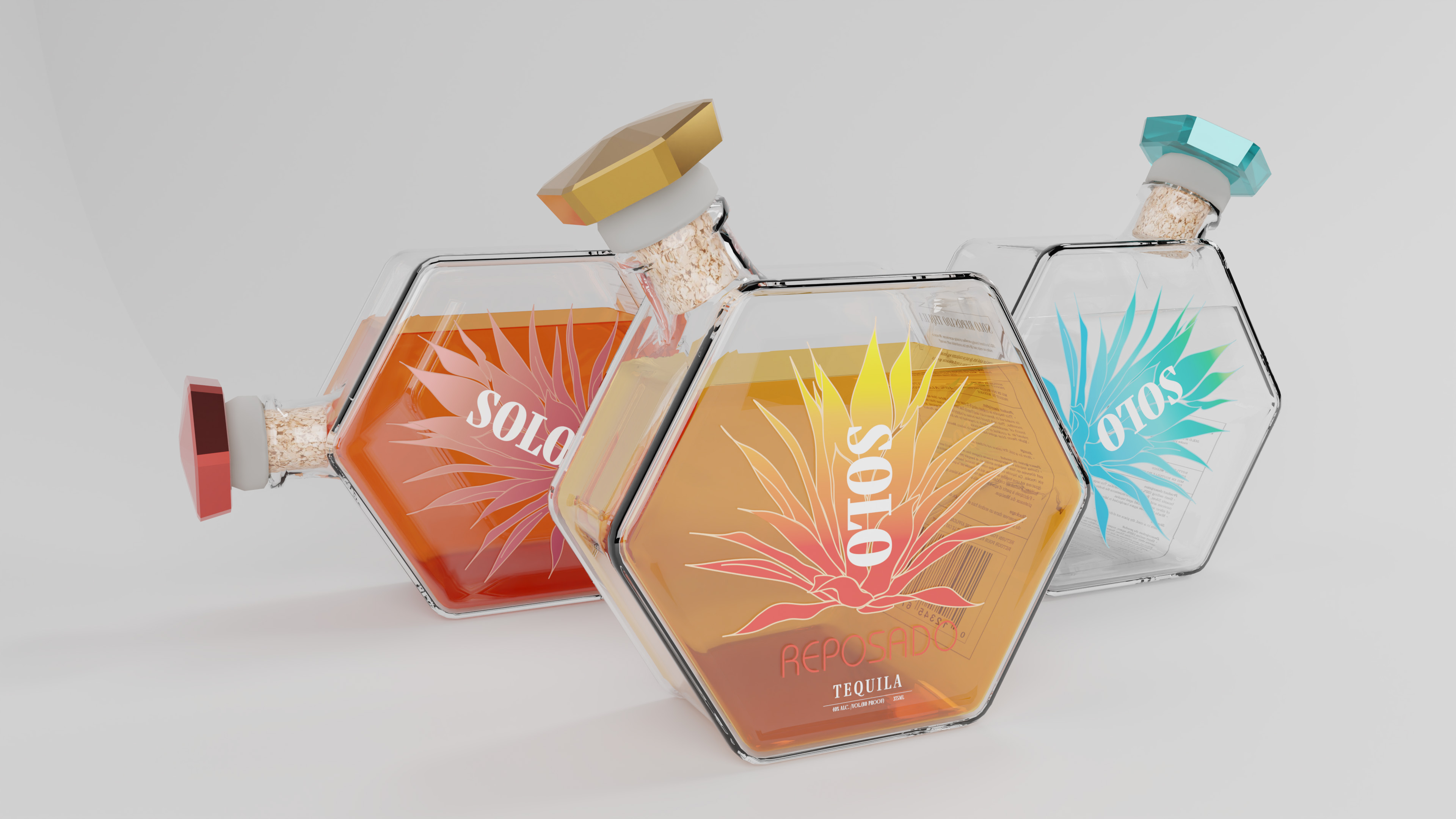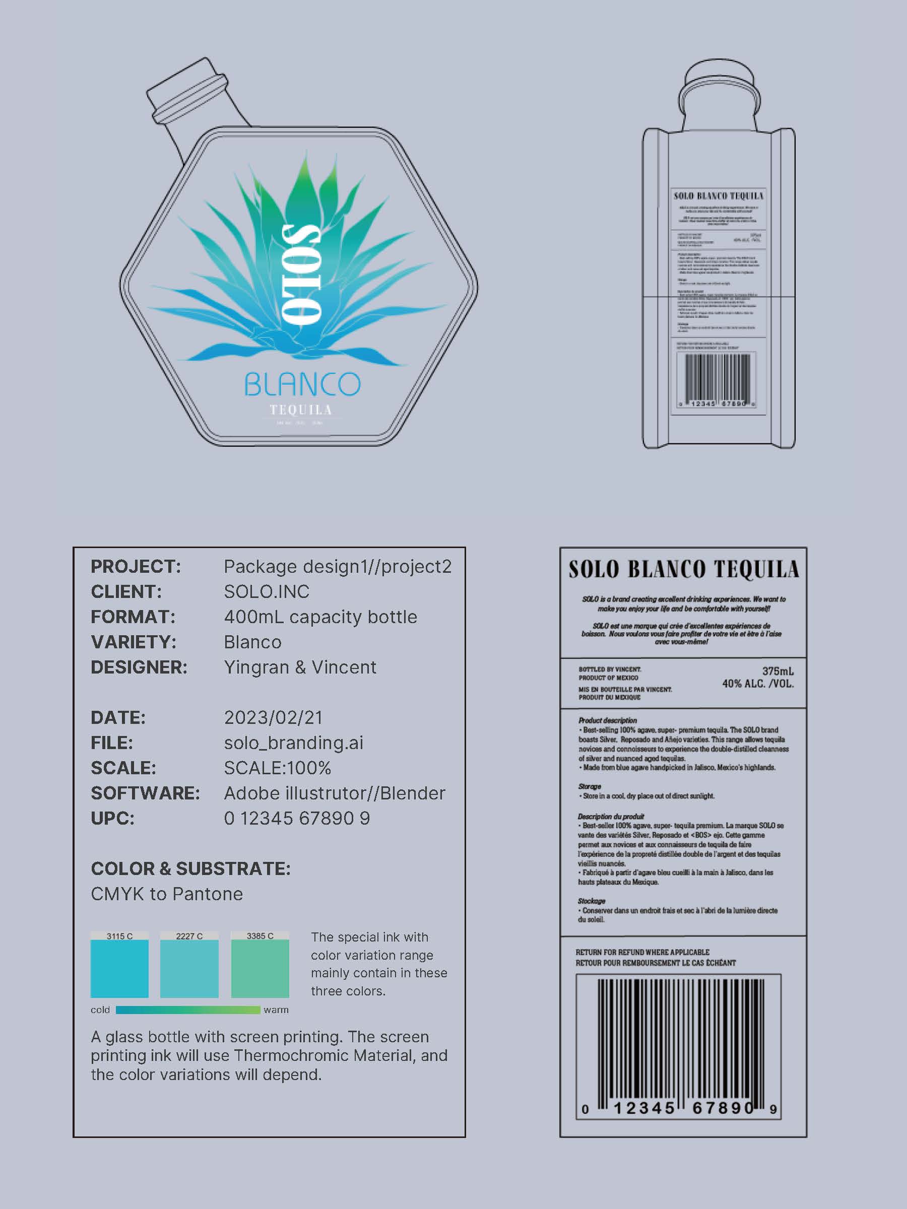 “Vincent Zhou and Yingran Xu collaborated on packaging design as a group project. We created a new tequila brand for busy young people in the city, named Solo, which represents the care and emotional value we provide for customers who enjoy tequila and living alone. We took a comprehensive approach to designing the bottle for a solitary drinking experience, making the six-sided bottle bottom interactive and fun. Additionally, we incorporated thermochromic materials into the silk-screen printing to visualize temperature changes, providing customers with a rich visual feast while reminding them to store the tequila at low temperatures.”
