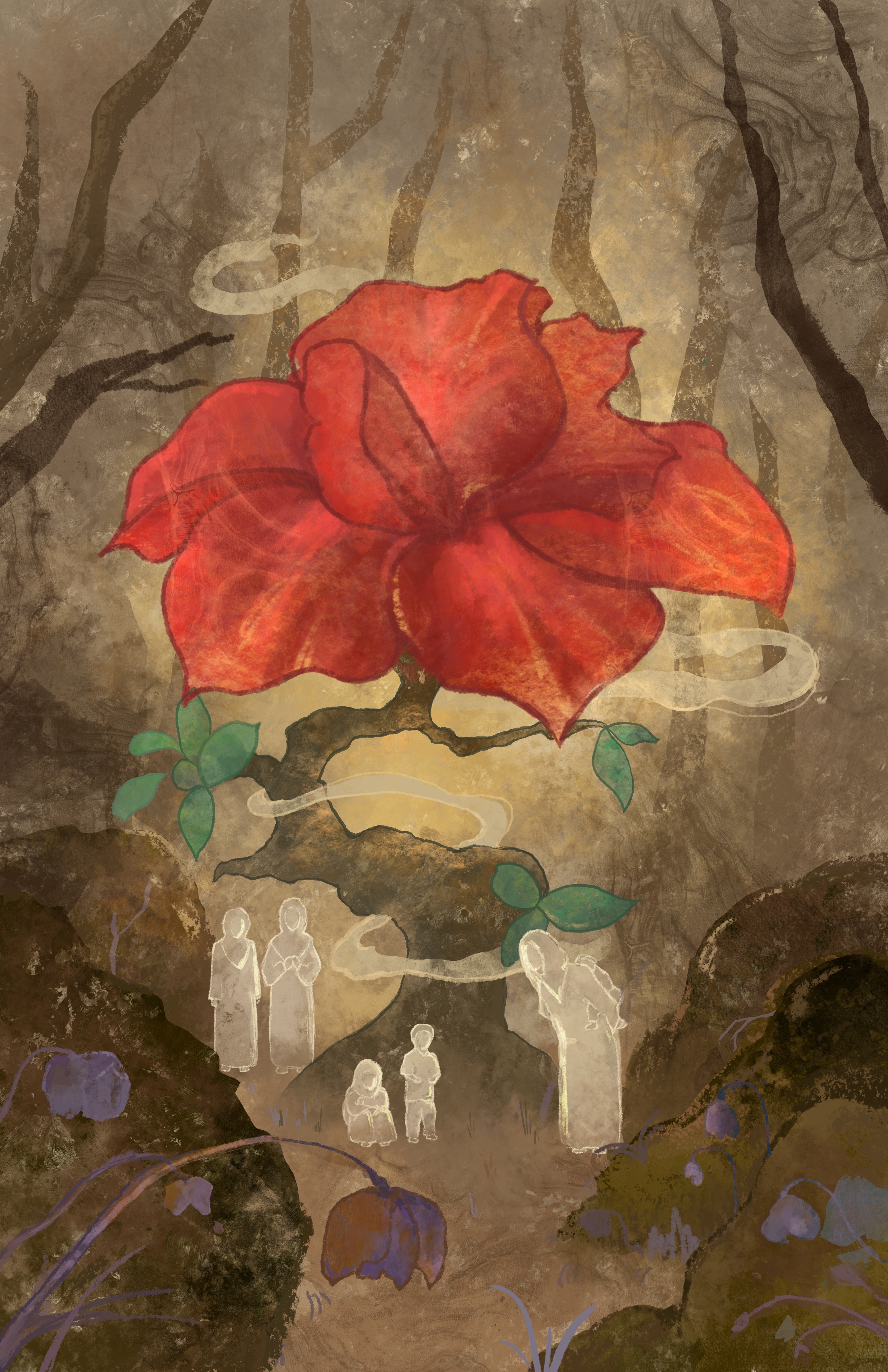 The desert rose's ability to bloom in a harsh environment, its petals guarding the refugees like an umbrella. This demonstrates the resilience of life and maps the refugees' deep desire for a safe place to return to and their lost homes.