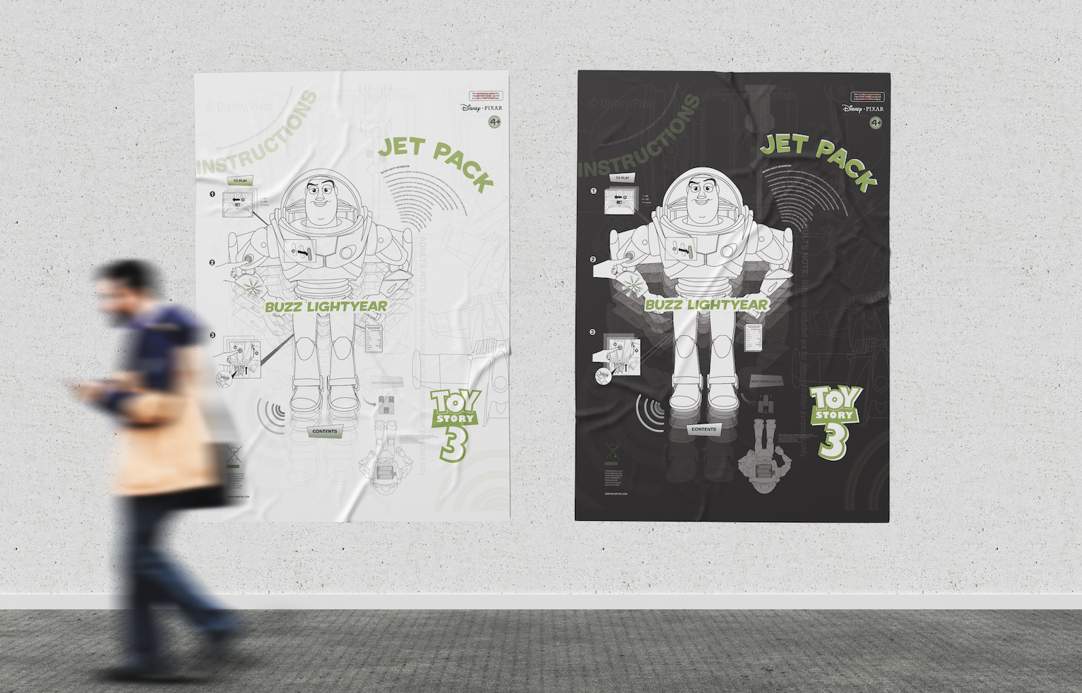 In this project, the aim is to redesign the instruction manual for the toy product, Jet Pack Buzz Lightyear, in a more engaging and immersive way. The goal is to break the implicit rule of fixed grid design and create a visually appealing layout that captures the viewer's interest and encourages participation in reading the manual. By utilizing the unique features of the toy Buzz Lightyear, the instruction manual will provide an unusual experience that guides users through the setup and usage of the toy.