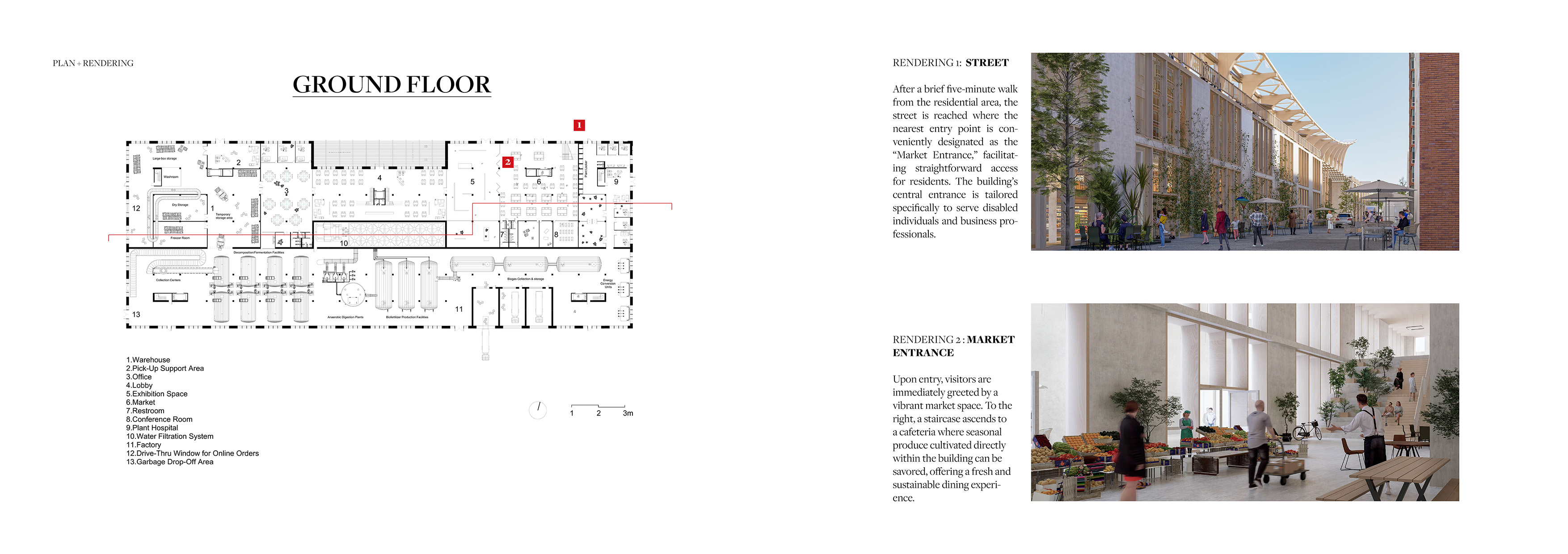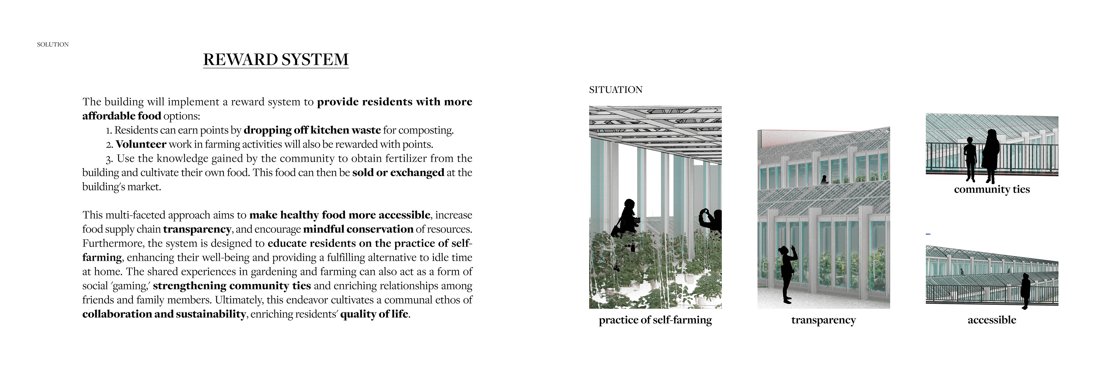 “Solution and Building Concept:SustainaSphere proposes a unique solution by involving residents directly in food production, thus increasing food transparency and trust. This project includes a multifunctional building with a market, a waste recycling fertilizer factory, and educational planting areas, promoting sustainable urban development. By participating, residents can earn food and planting materials through a reward system, helping make healthy food more accessible and fostering a community spirit of sustainability and cooperation.”