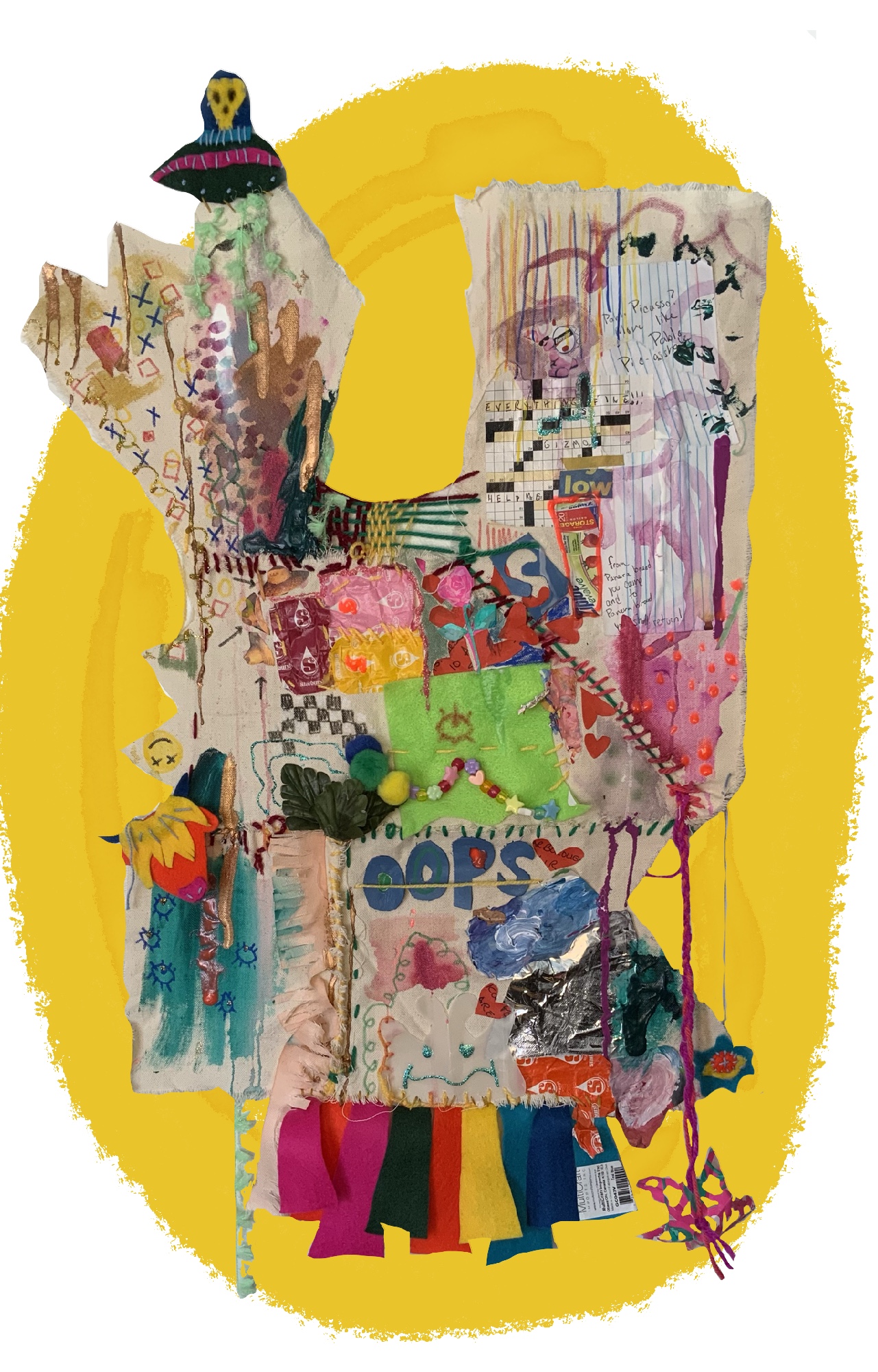 “brain hurt, head ĕ̸̡̜͑m̴̥͎̂̄̅̎̓̚p̷̠͈̻̱̩̯̫̦͎̑͌̑̓͋ṭ̵̻̫͈̦̩̭̬͕̍y̶̹͛̈́̐̈̕͝” is a turbulent clutter of collage and kitsch, documenting my neurodivergence. I work to depict thoughts and emotions abstractly through the format of iSpy games, where representations of my idiosyncrasies live. Some of the items are explicitly labelled and others are left up to the viewers’ interpretation. Mental health/illness, autism, ADHD, and anxiety; they can all present differently. This body of work is built out of my own experiences, but can simultaneously function as signifiers for others to connect with. Each piece is accompanied by a legend of "things to find".