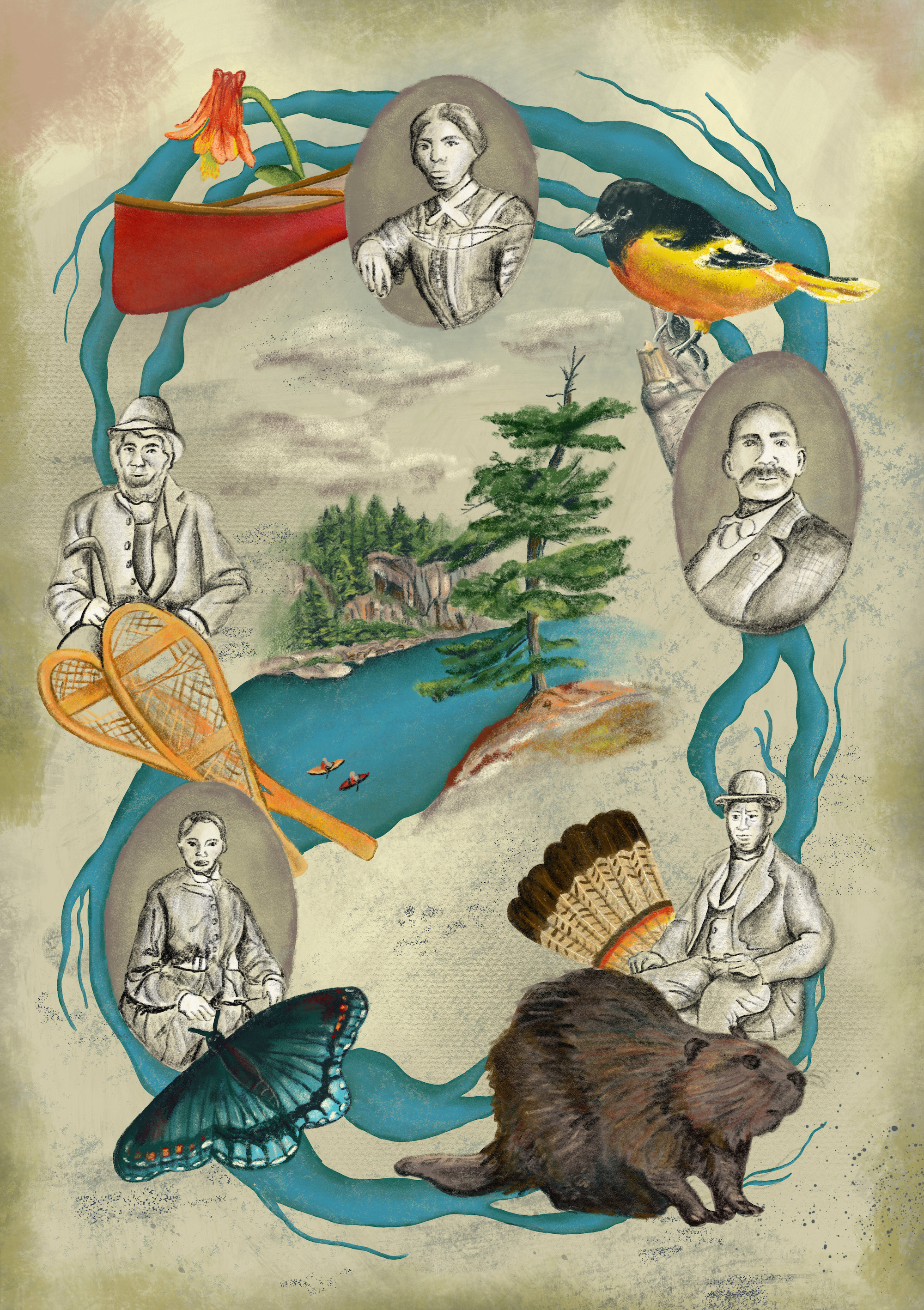 This is editorial illustration is intended to accompany an article in the Narwhal magazine on the topic of underrepresentation of Black narratives in the context of the history of Canada's National Parks. The author specifically talks about the history and relationship of several Black individuals to Ontario rivers, such as Harriet Tubman's many crossings of the Niagara River to bring former slaves to safety. In this illustration, I wanted to show individuals from the article intertwined with imagery from Canadian natural landscapes, with the rivers connecting them all, and in a context in which you would usually see historical imagery of your stereotypical white colonists.
