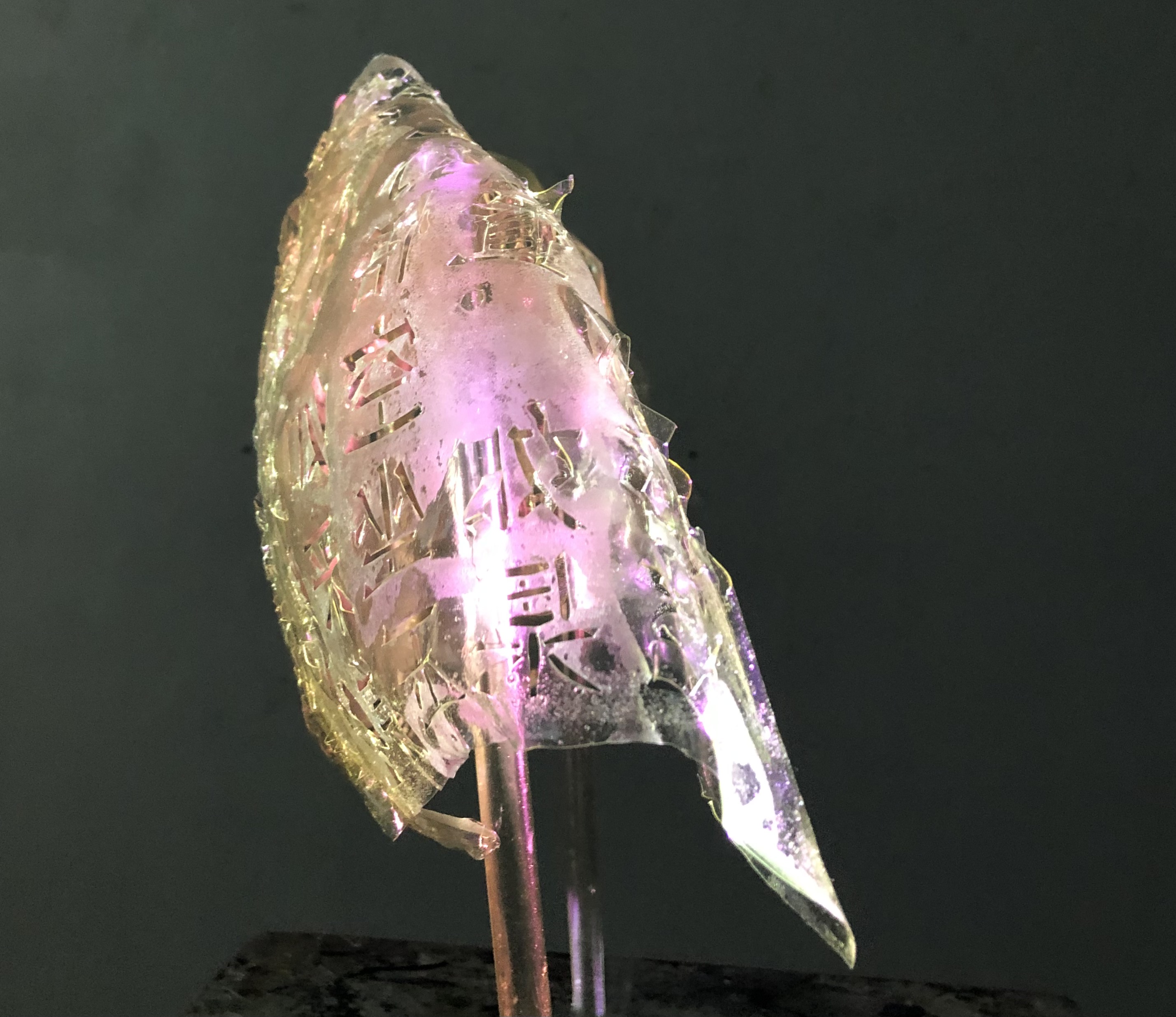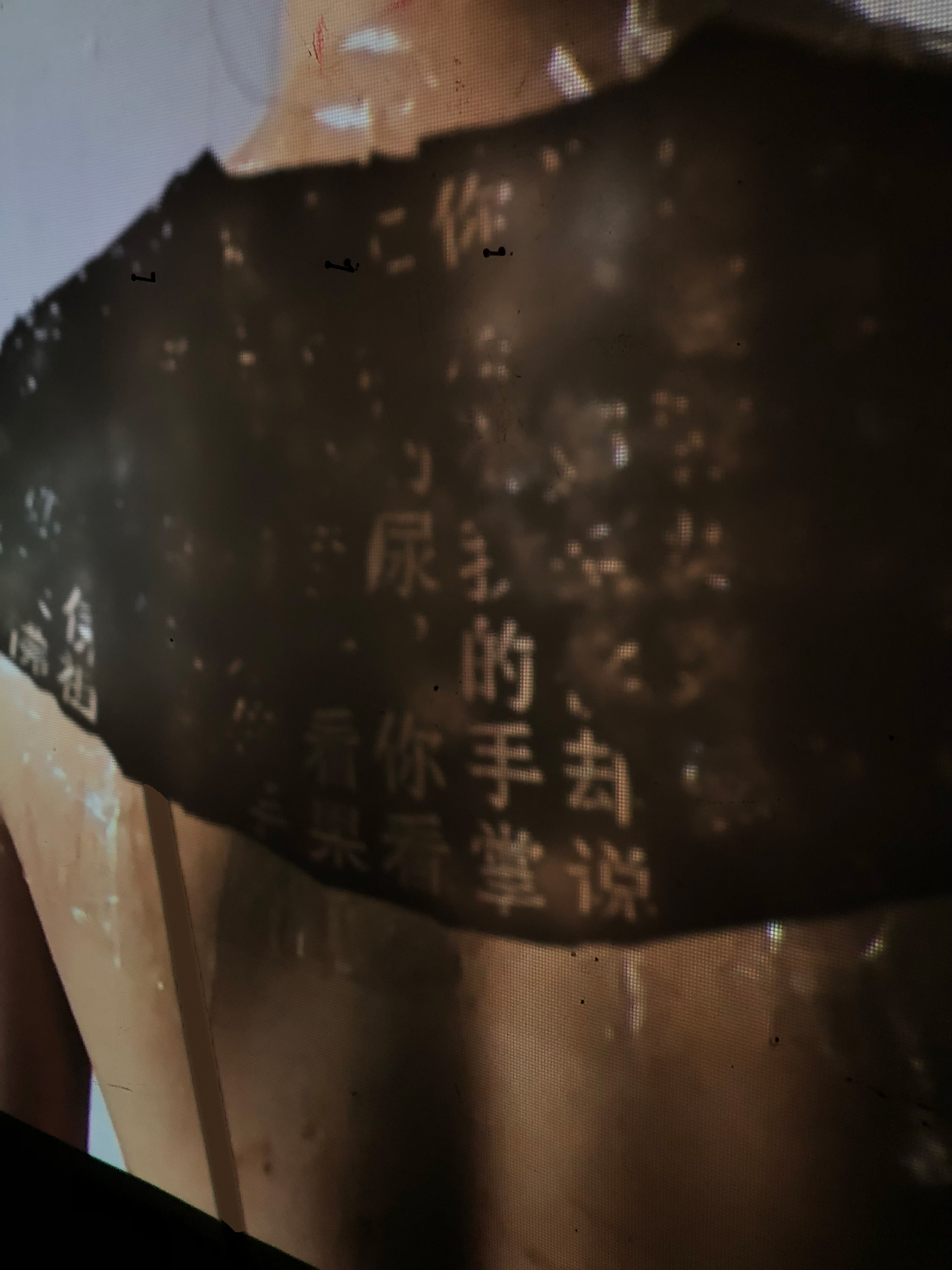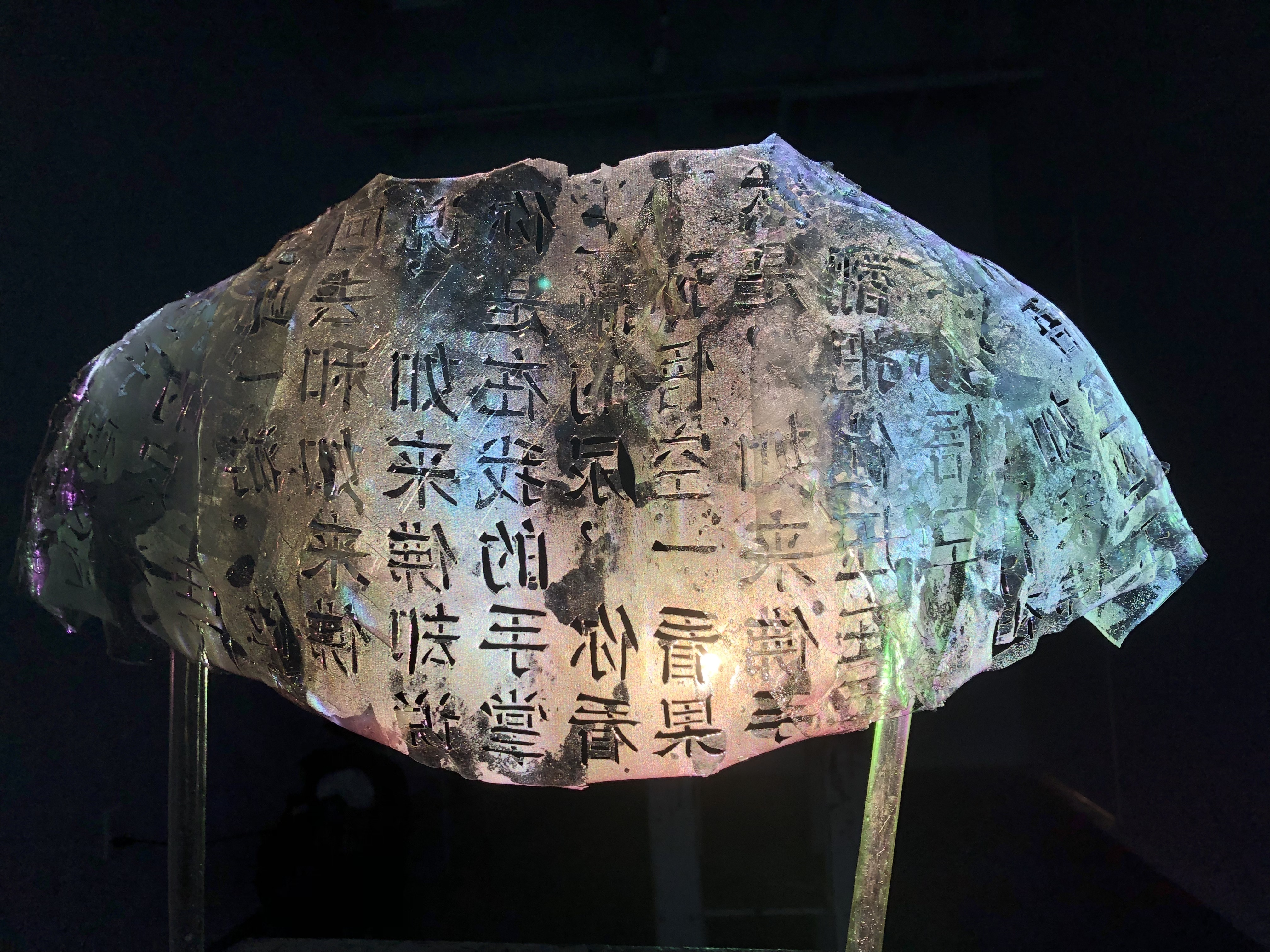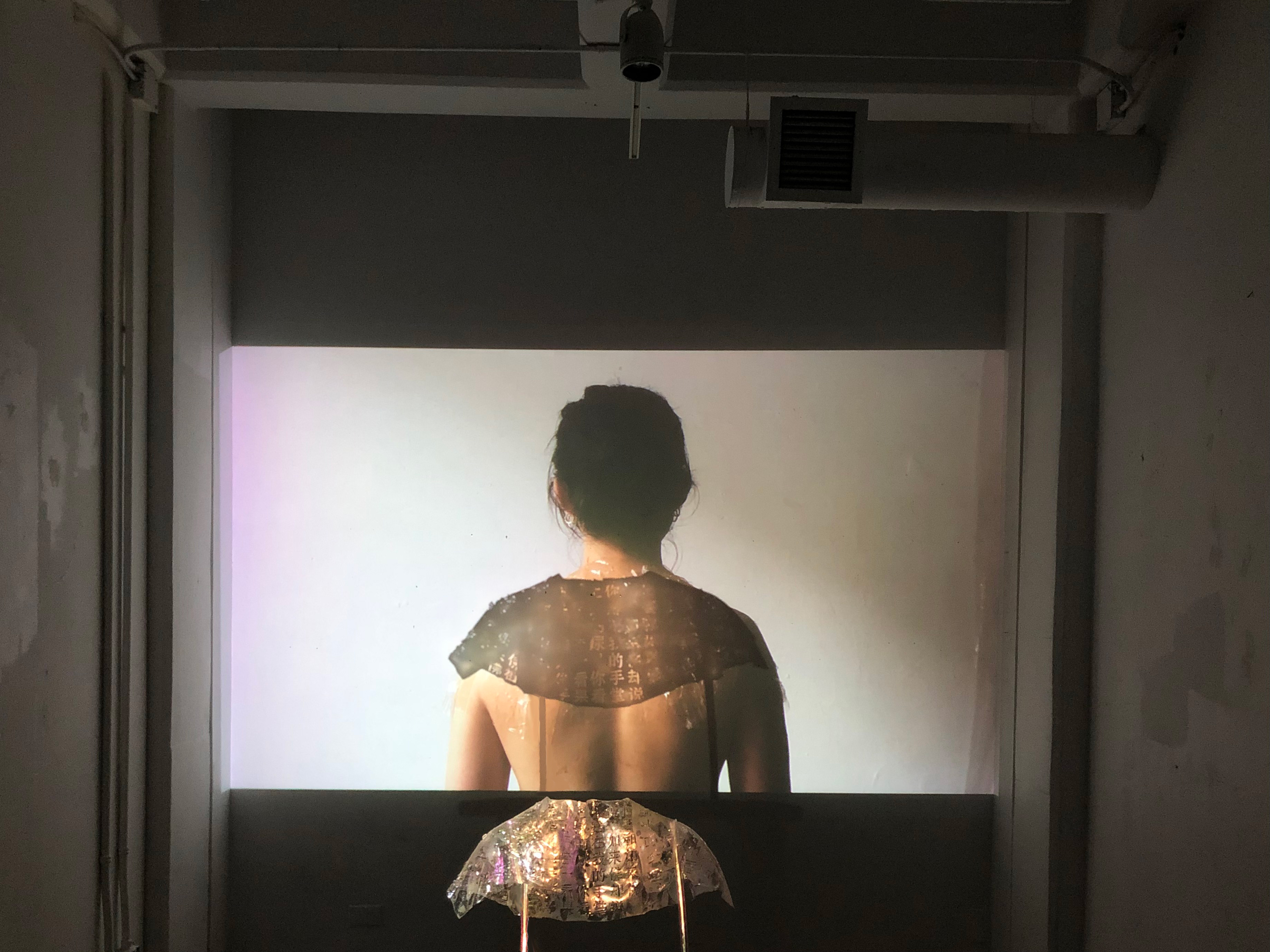 Gelatin bioplastic featuring text from Journey to the West was hand-cut, then molded to my shoulders, beginning soft and pliable but slowly stiffening into an exoskeleton. Memory and nostalgia as a source of both comfort and restriction. Members of diasporic communities are often forced to hold onto history to feel authentic to their culture, whether it be myths and legends, or ancient history. But when does this become restrictive to present growth? What does the contemporary existence and future of my community look like?