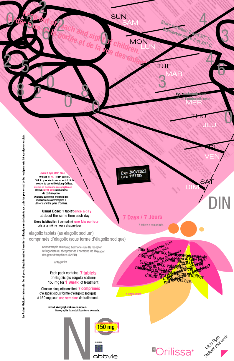 This poster is created using only the elements of an Orilissa package (a medication used to treat endometriosis)