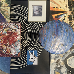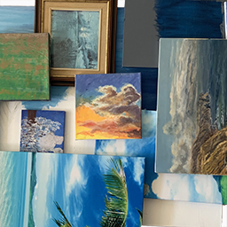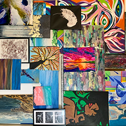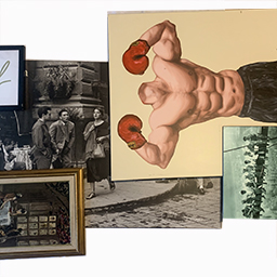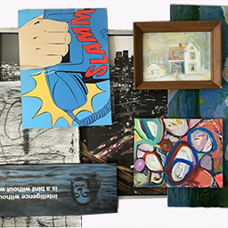 The Future of Happiness – Reclaimed Artworks Panel, 30x8ft. Helio Eudoro, 2022. Found paintings, drawings, prints, pictures on canvas, paper, wood, metal, glass, plastic, and plywood. (Simulation gallery view)