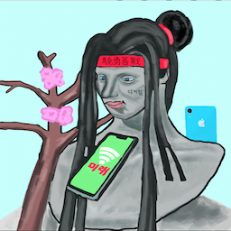 A photoshop illustration of my samurai statue with a mobile phone from North Korea.