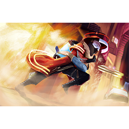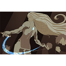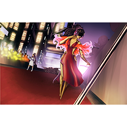 Ame dancing before the Rasu company logo. Helping to bring forth a dawn of prosperity to the company.