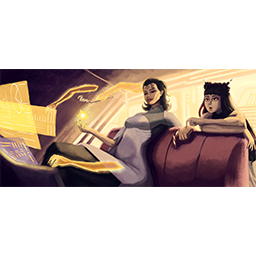 Amaterasu, the Sun Goddess, depicted as a Ceo going over her company numbers with her right hand Ame no Uzume.