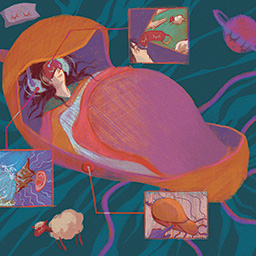 An advertising poster of a sleeping pod, people can sleep in here will feel like floating in space and won't be bothered with anything.